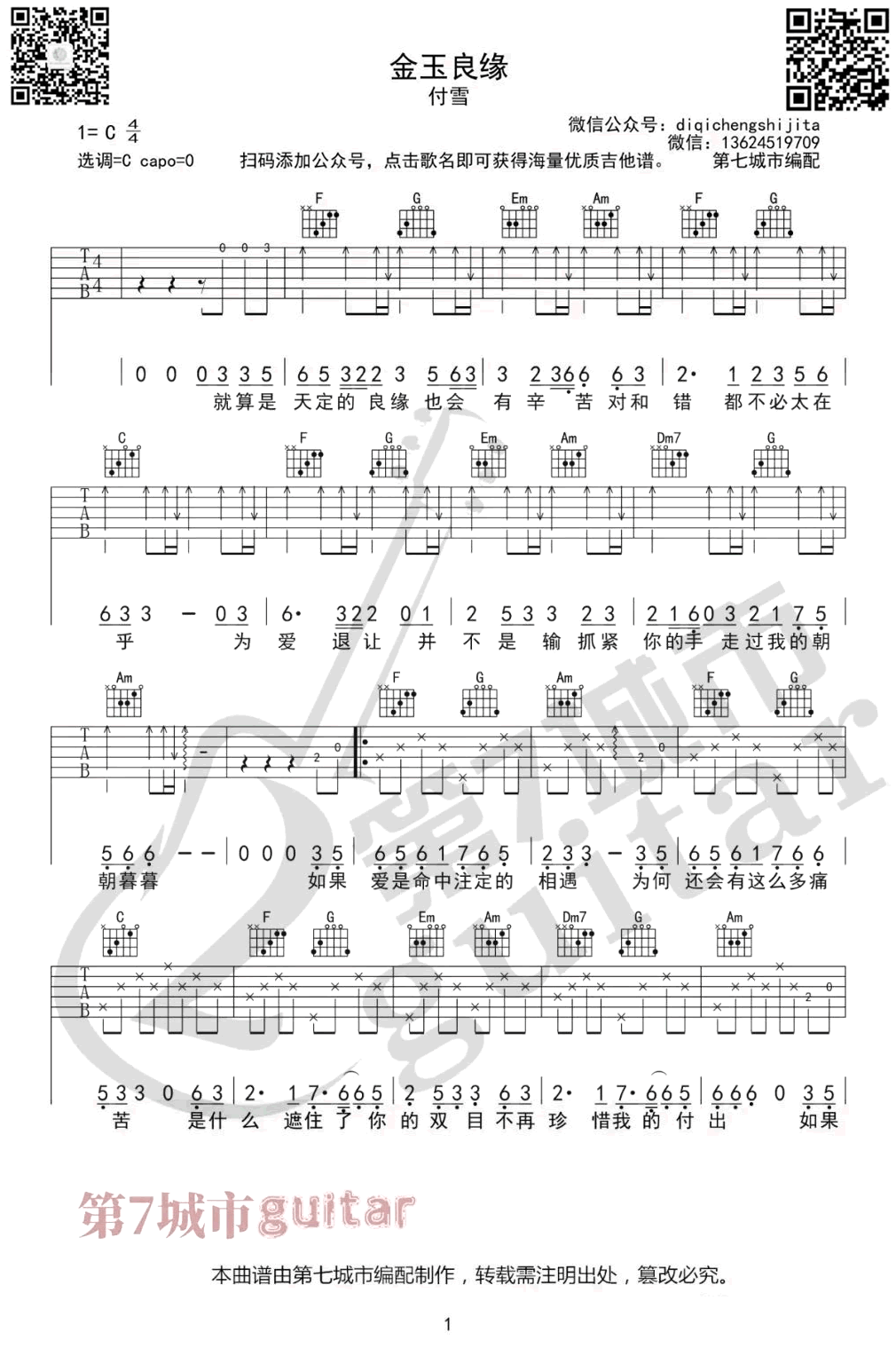 曲谱介绍: 付雪/李琦《金玉良缘》吉他弹唱谱,采用C调指法编配,共有3张高清图谱。