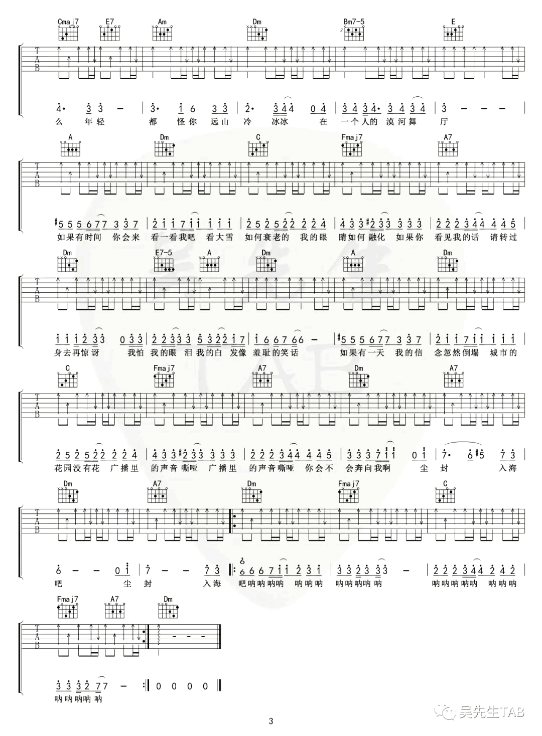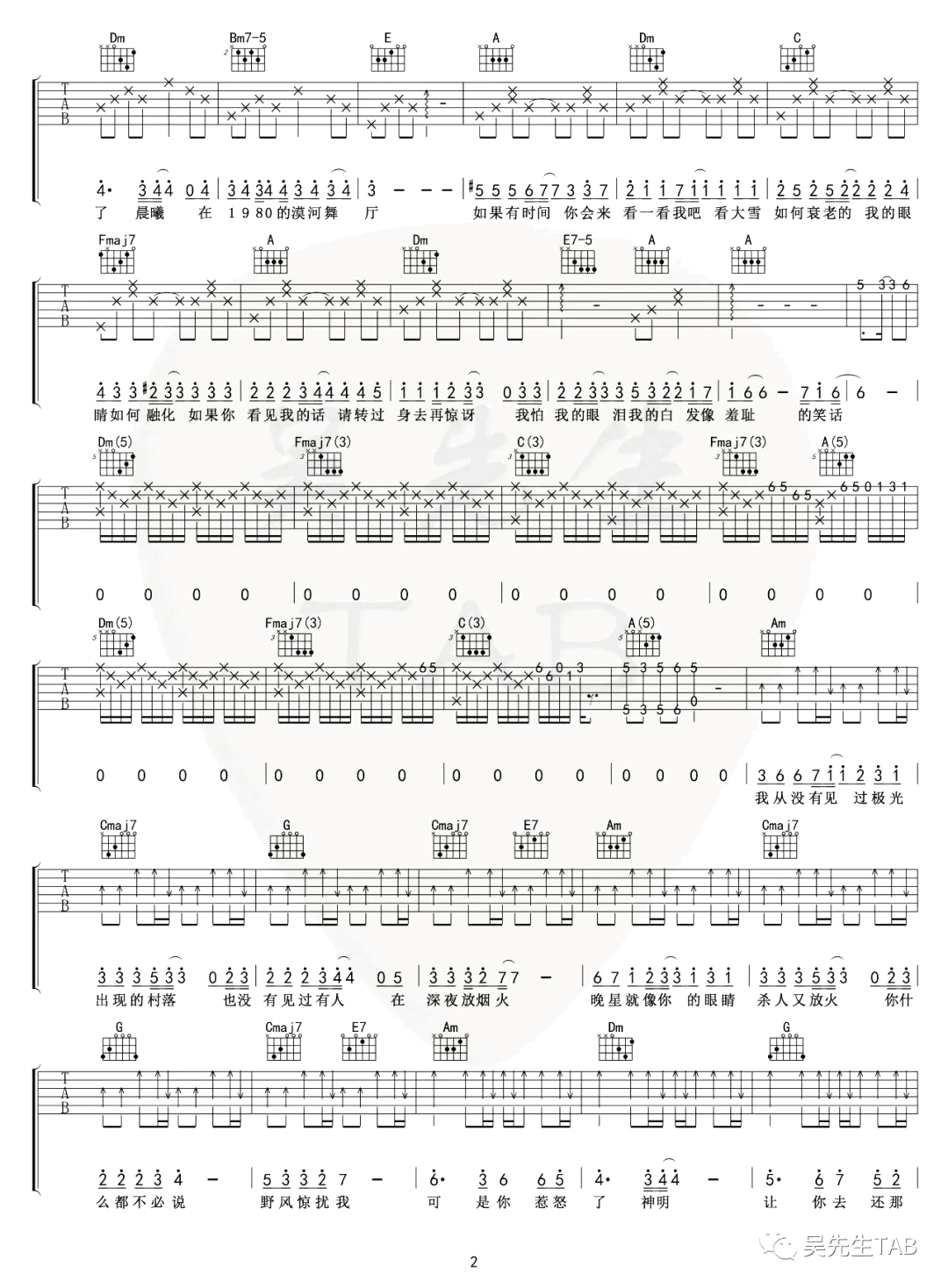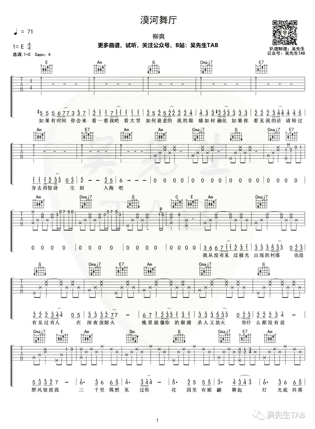 曲谱介绍: 漠河舞厅吉他谱,柳爽词曲演唱的一首原创民谣歌曲,最近在网络爆火。漠河舞厅六线谱,原调E选调C,CAPO夹四品,三张弹唱图片谱。