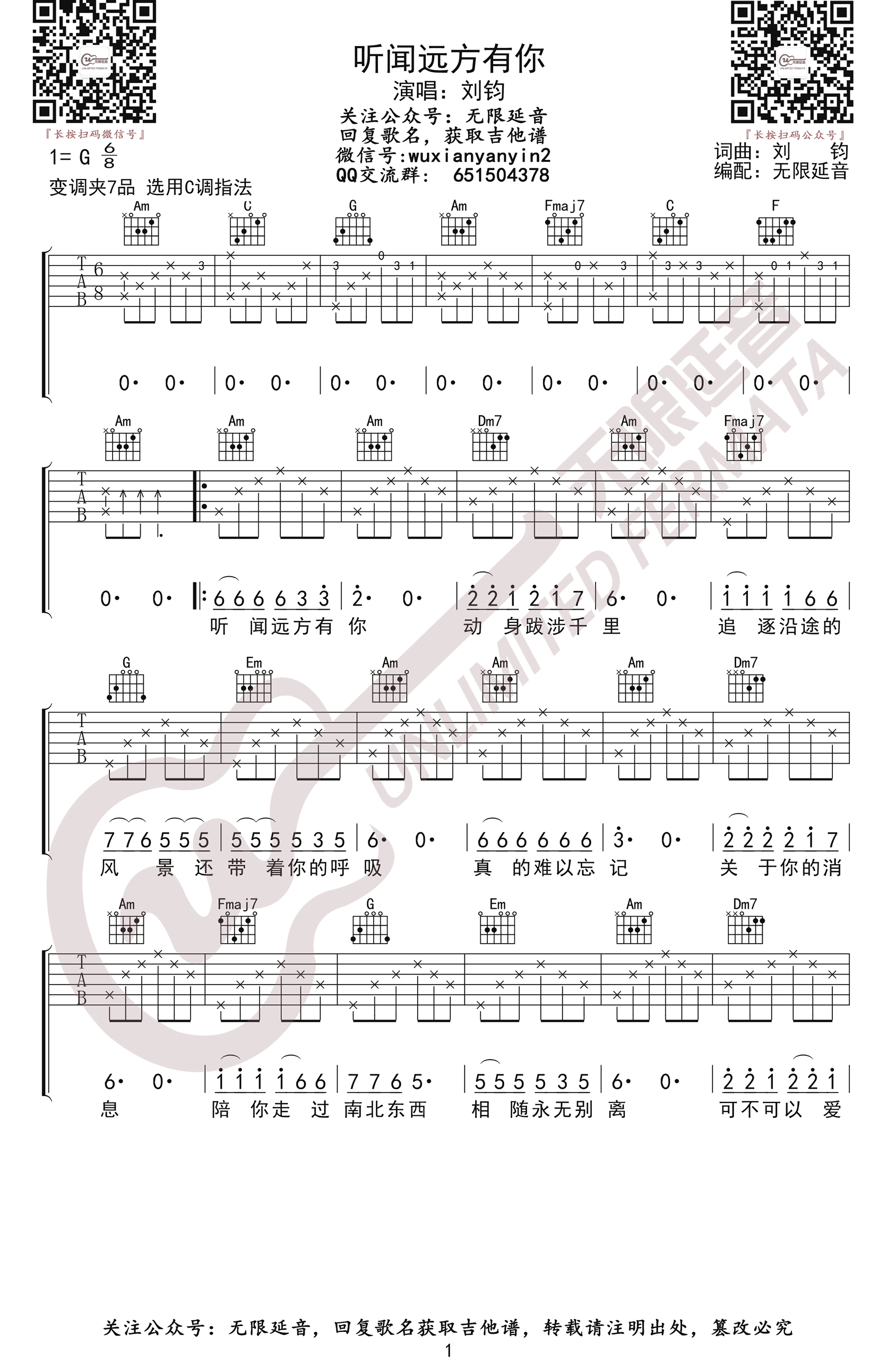 曲谱介绍: 听闻远方有你吉他谱,刘钧词曲创作的一首火遍大江南北的网络热门歌曲,原调G,变调夹二品,选用C调指法,《听闻远方有你》吉他弹唱谱,共三张高清图片六线谱。