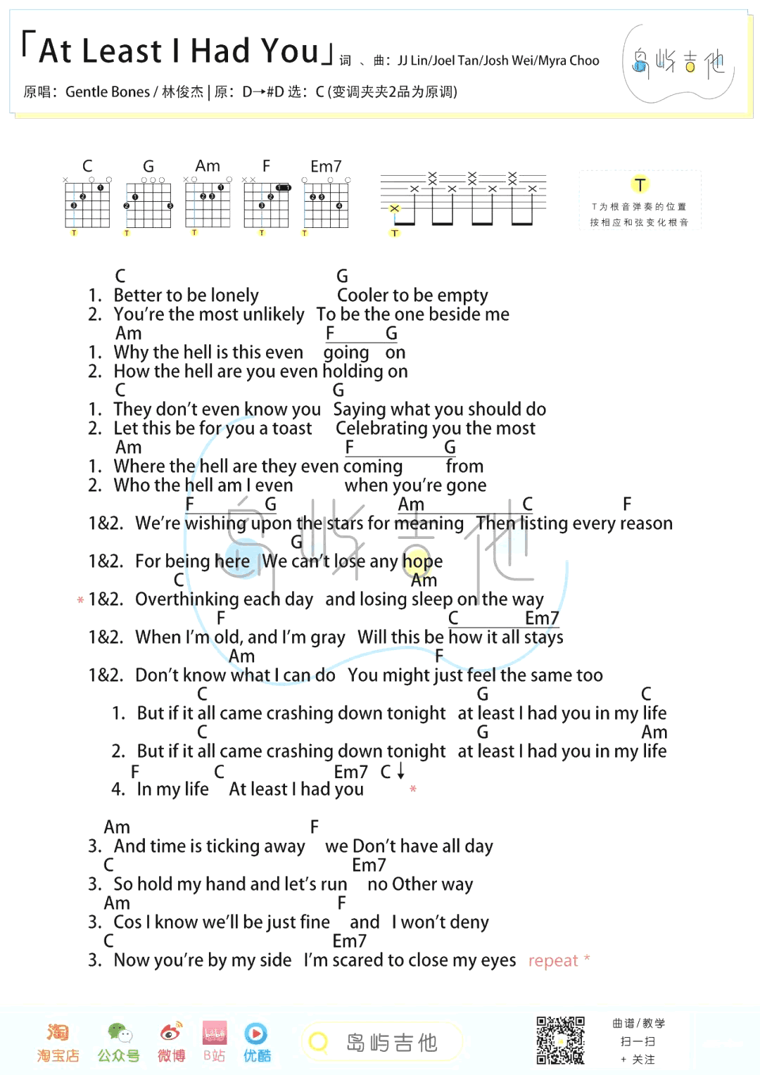 曲谱介绍: 《At Least I Had You》吉他谱,这是林俊杰与Gentle Bones合唱的一首英文歌曲,At Least I Had You吉他弹唱谱,选用C调指法,变调夹夹第二品为原调,共一张和弦图片谱例。
