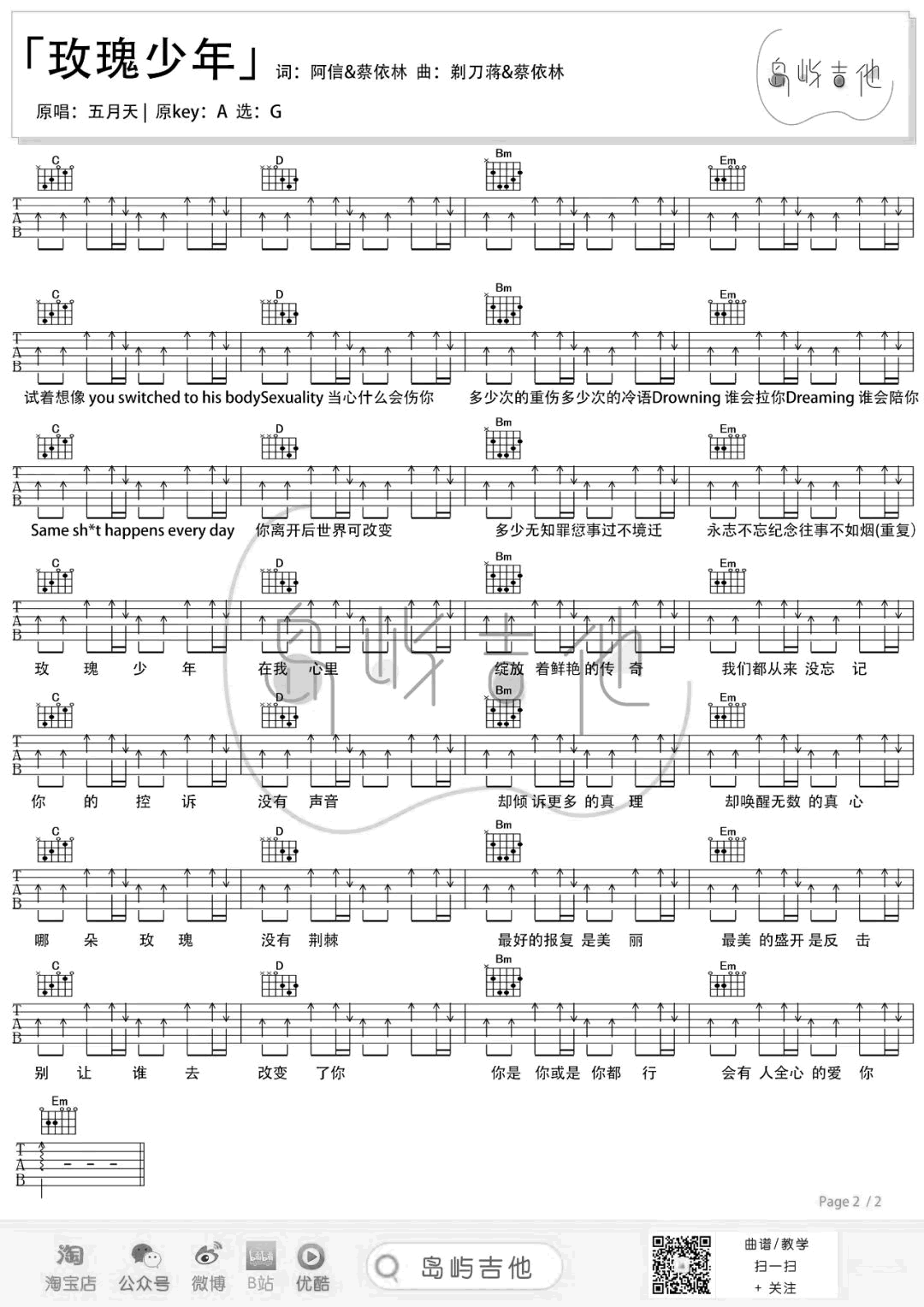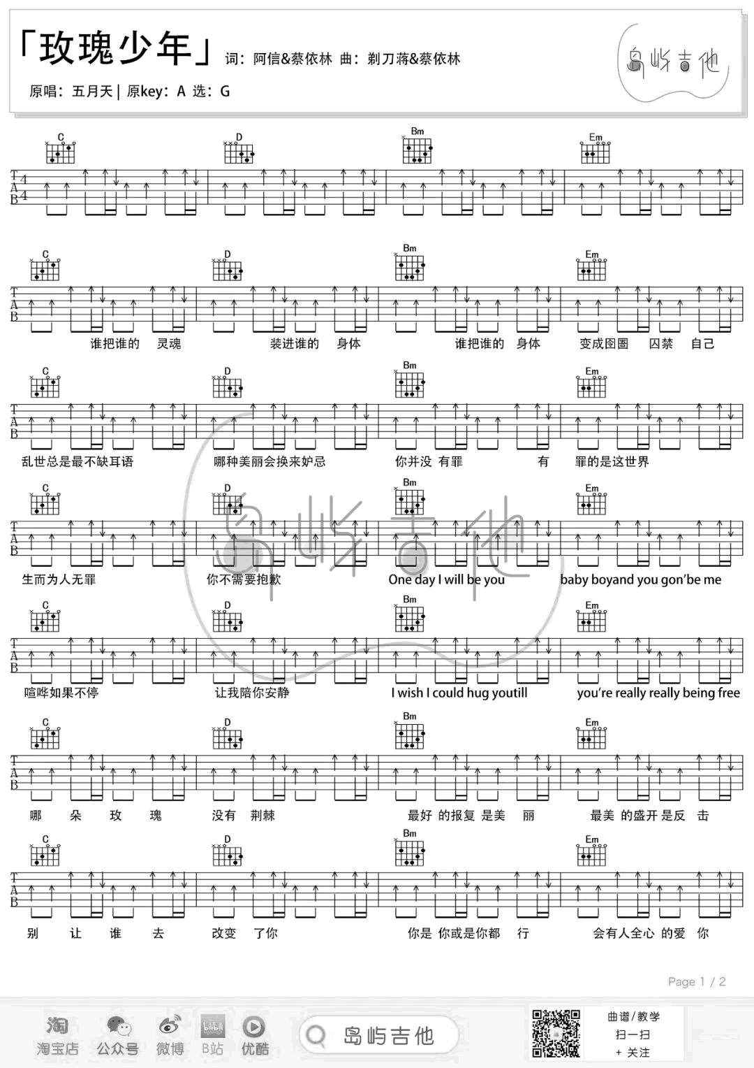 曲谱介绍: 蔡依林/五月天《玫瑰少年》吉他弹唱谱,采用G调指法编配,共有3张高清图谱。