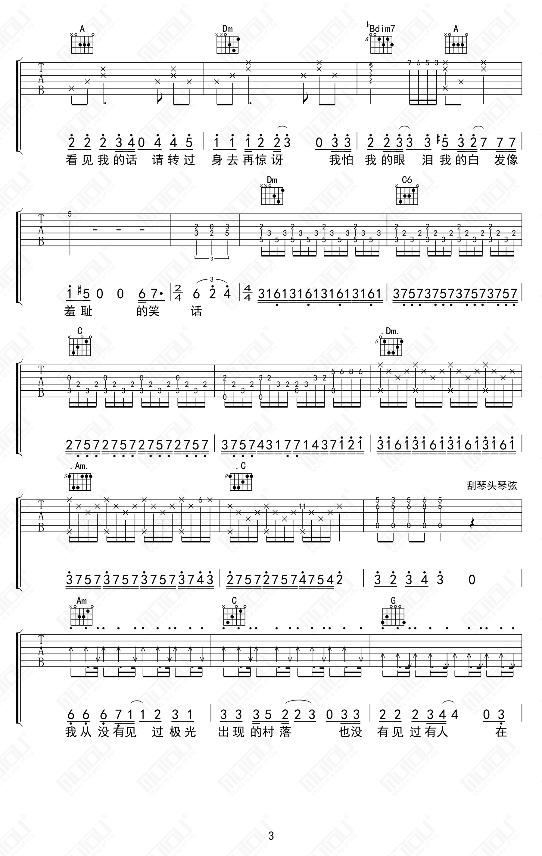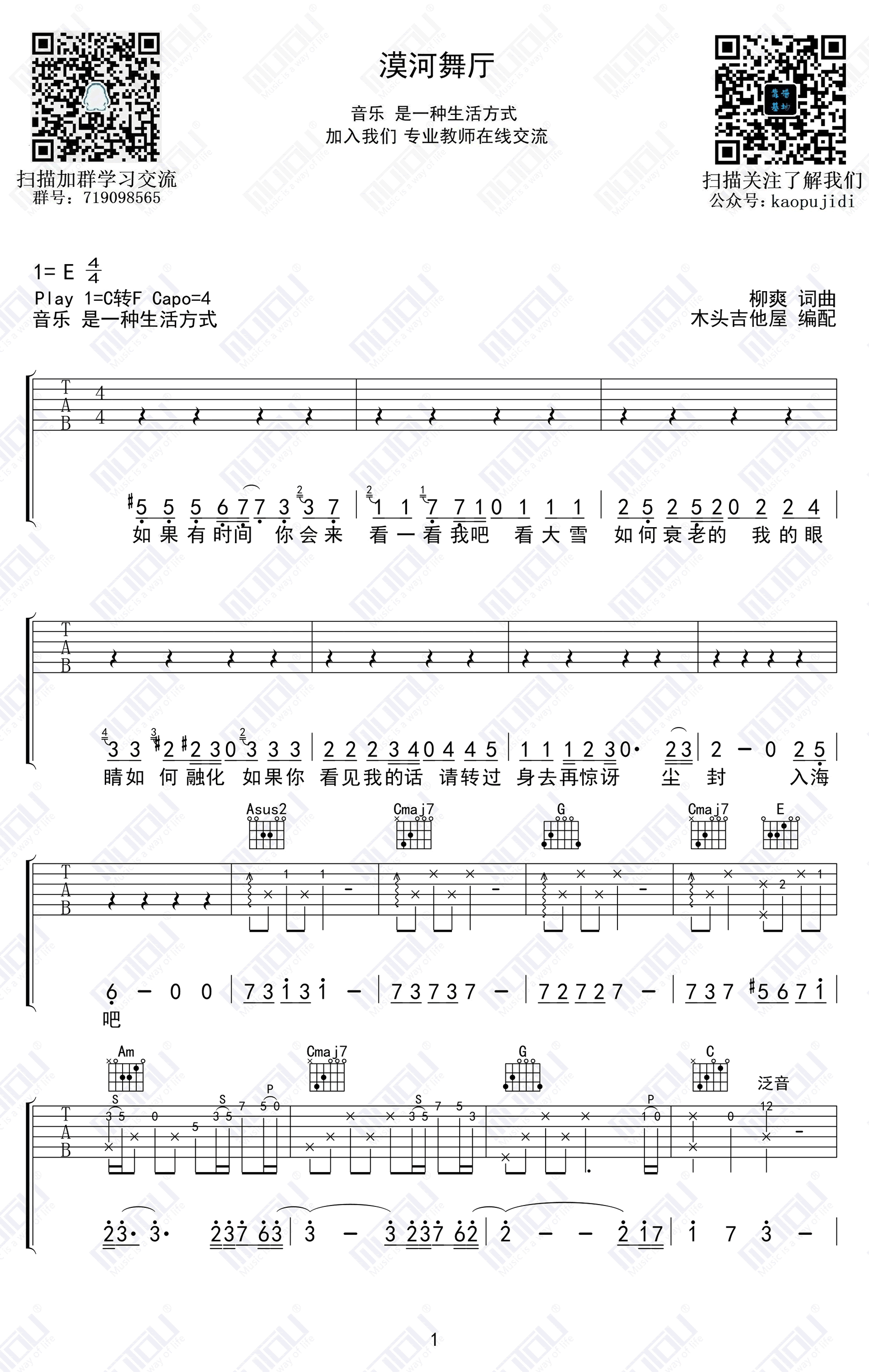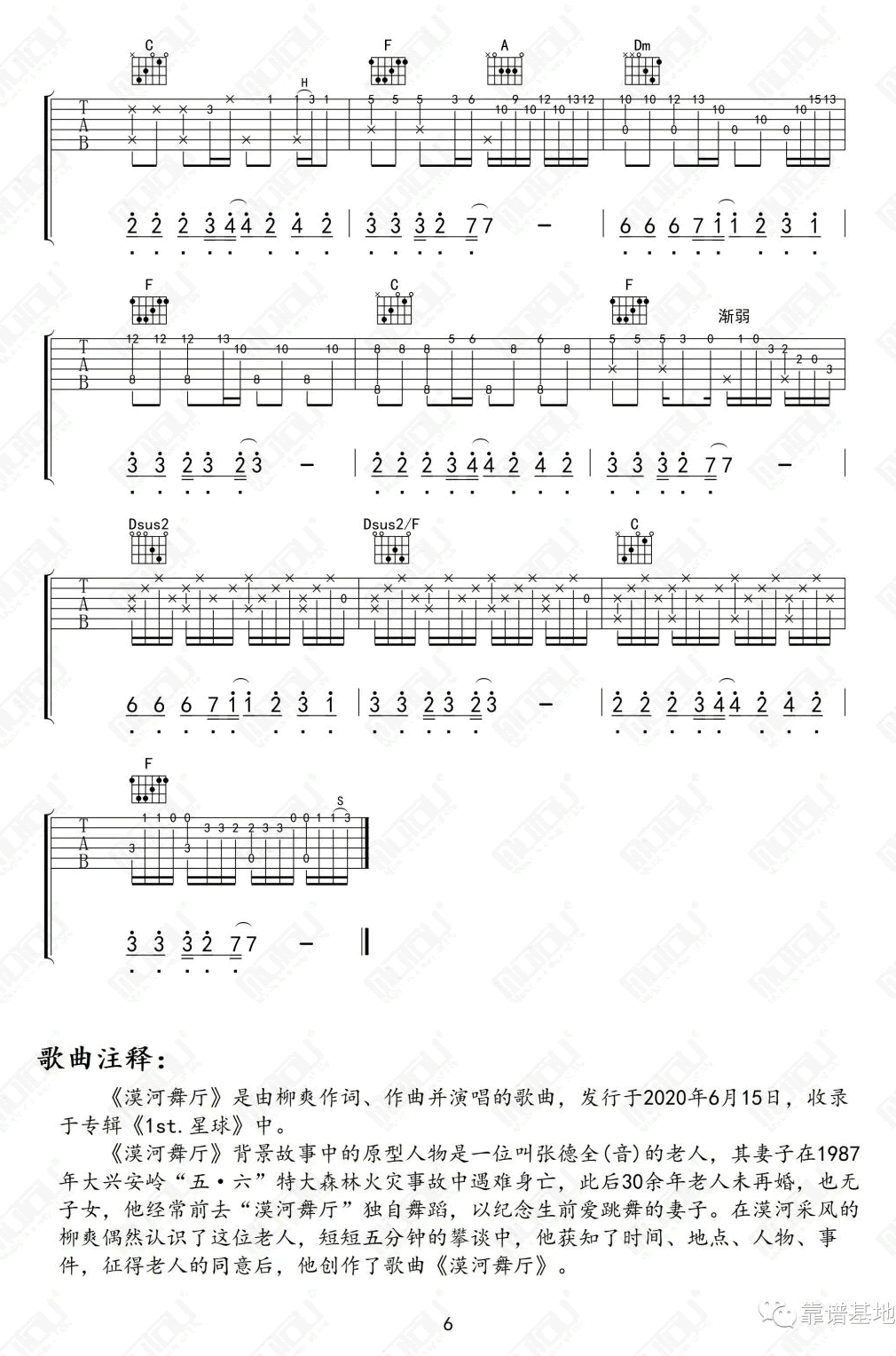 曲谱介绍: 漠河舞厅吉他谱,柳爽词曲演唱的一首民谣歌曲火遍全网,原调E,选用C转F调,Capo夹四品,《漠河舞厅》吉他弹唱六线谱,完整编配共六张高清图片谱例。超难编配 很有意思的一个版本。