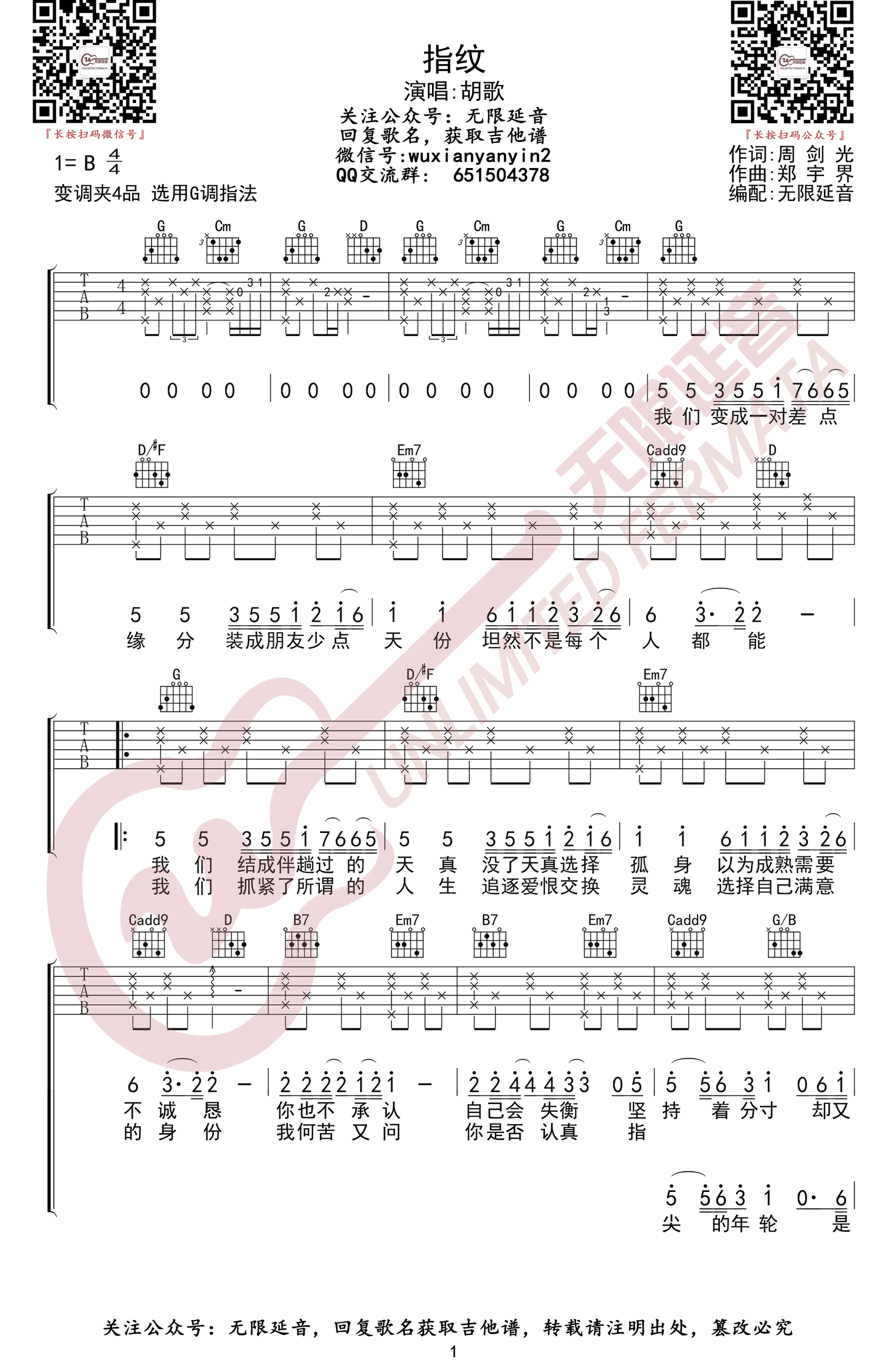 曲谱介绍: 指纹吉他谱,胡歌的一首老歌,电视剧《轩辕剑之天之痕》主题曲,最近被杜宣达翻唱重新火了起来。指纹吉他弹唱谱,原调B选用G调指法,变调夹夹四品,两张图片六线谱。