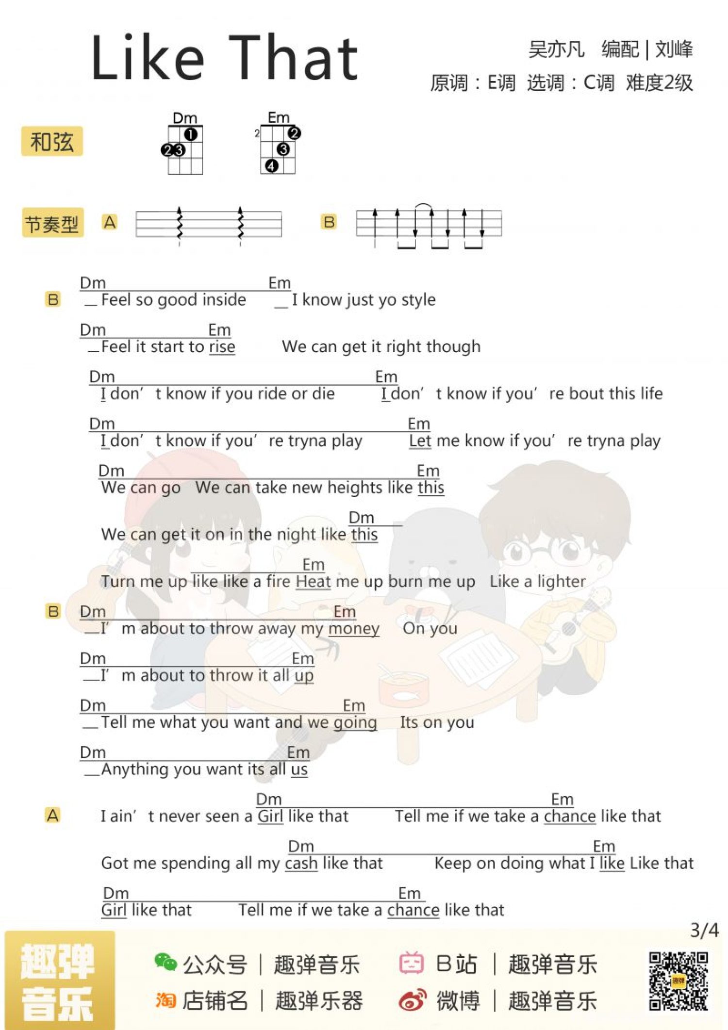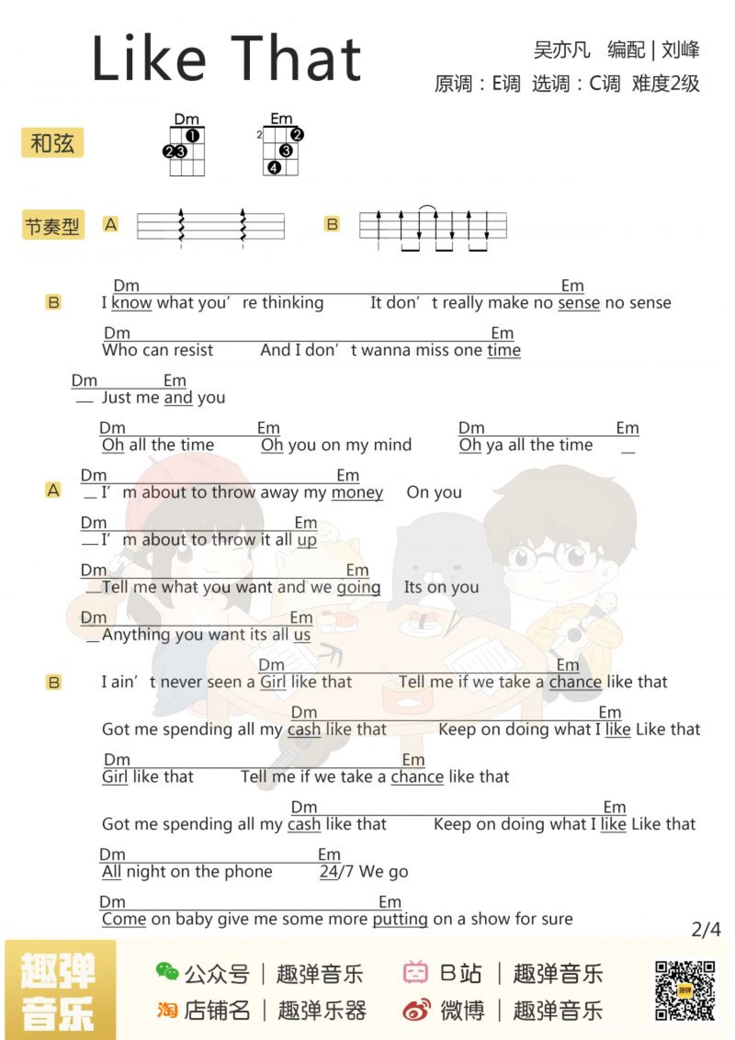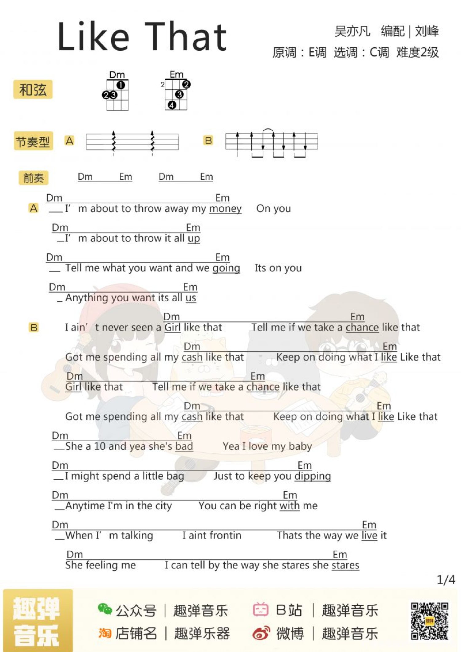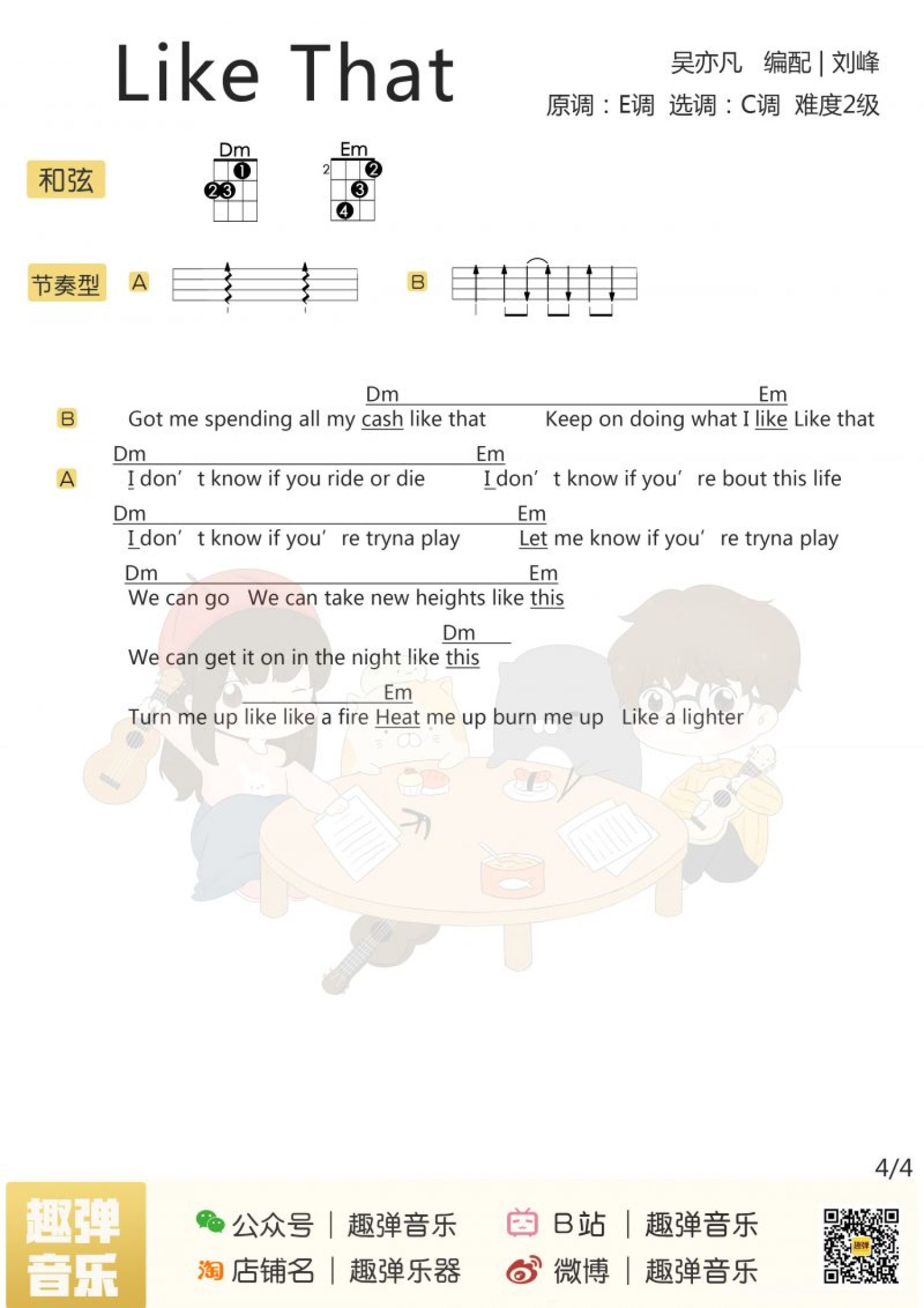 曲谱介绍: 《Like That》尤克里里弹唱谱 Aloha,今天要分享的这首歌 可是美国iTunes音乐榜单的双冠王 曾一举拿下总榜和hip-hop分榜 并驻扎榜首一周之久 它就是吴亦凡的「Like That」 不同于以往节奏感强烈的歌曲 它给你的感觉像是在夏日的派对 有点慵懒而又有些浪漫
