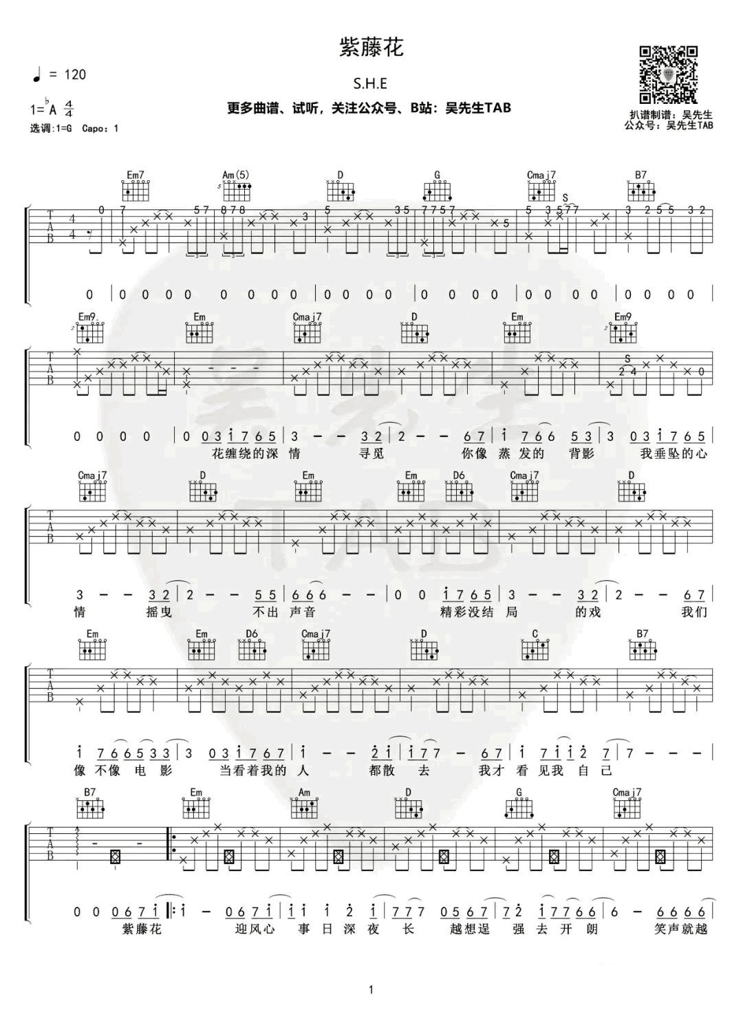 曲谱介绍: S.H.E的一首充满浓浓拉丁风情的伤感情歌,紫藤花吉他谱,原调降A,选调G,CAPO夹一品。《紫藤花》吉他弹唱谱,三张图片六线谱。吉他帮整理上传。这首歌曲旋律翻唱自Westlife(西域男孩)的《Soledad》,中文版唱出紫藤花缠绕的爱情,那是醉人的恋情,依依的思念;也有沉迷的、执著的、缠绵悠长的爱意。