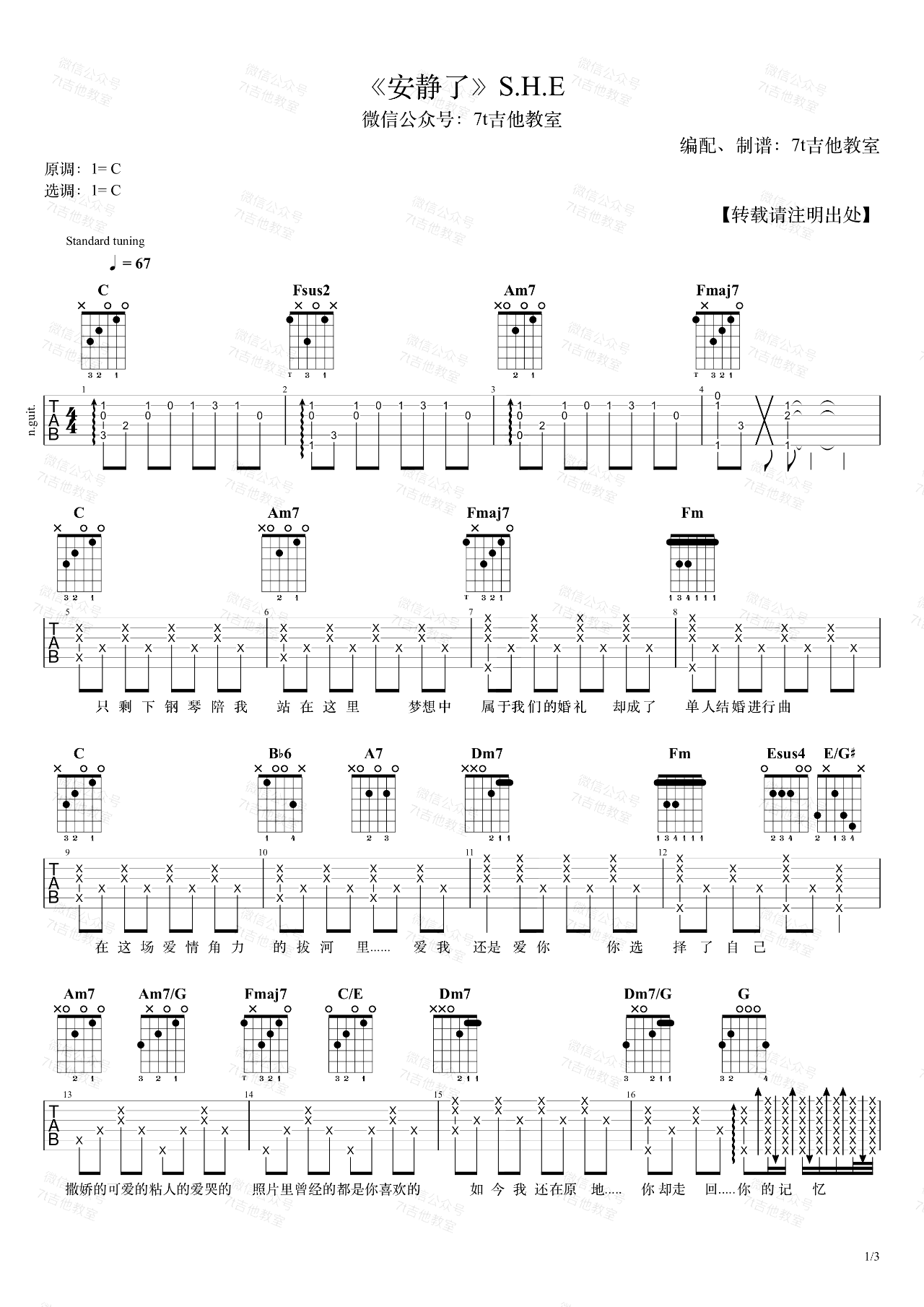 曲谱介绍: S.H.E的一首非常值得循环的老歌,安静了吉他谱,三张弹唱六线谱。这首歌的原调是C大调,老师用的也是C大调的指法来编配。《安静了》吉他演示视频里是标准音调弦,变调夹夹在第1品。想弹原调的话不夹变调夹就可以哦~和弦分析:和弦色彩方面,四级用了maj7,某些地方还用了四级小和弦;二级、三级、六级用了小七,其中三级和六级某些地方还用了大三和弦或属七(作为副属和弦);五级用了2m7/5(作用类似4/5)…… 第一段 Fmaj7 → Fm 用了四级小和弦,后面 C → Bb6 → A7 → Dm7 用了降七级使得低音部分有一个特殊的下行,六级用A7也起到了副属和弦的作用,短短几个和弦进行就用了很多丰富的编排技巧,周董作曲的歌还是很值得研究的。后面多次出现的 E/G# → Am7 也是副属和弦的运用。 「撒娇的可爱的……」这一句 Am7 → Am7/G → Fmaj7 → C/E → Dm7 还有副歌的开头 C → G/B → Am7 用了很多斜杠和弦,使得低音部分有一个顺畅的下行。