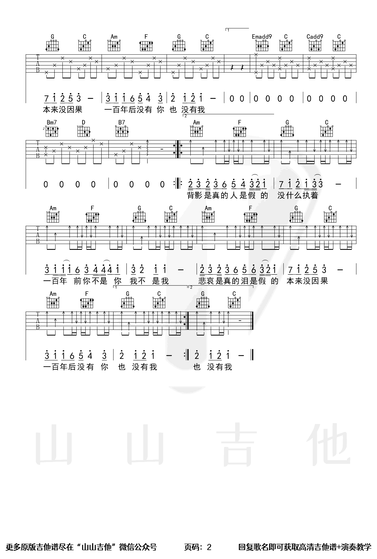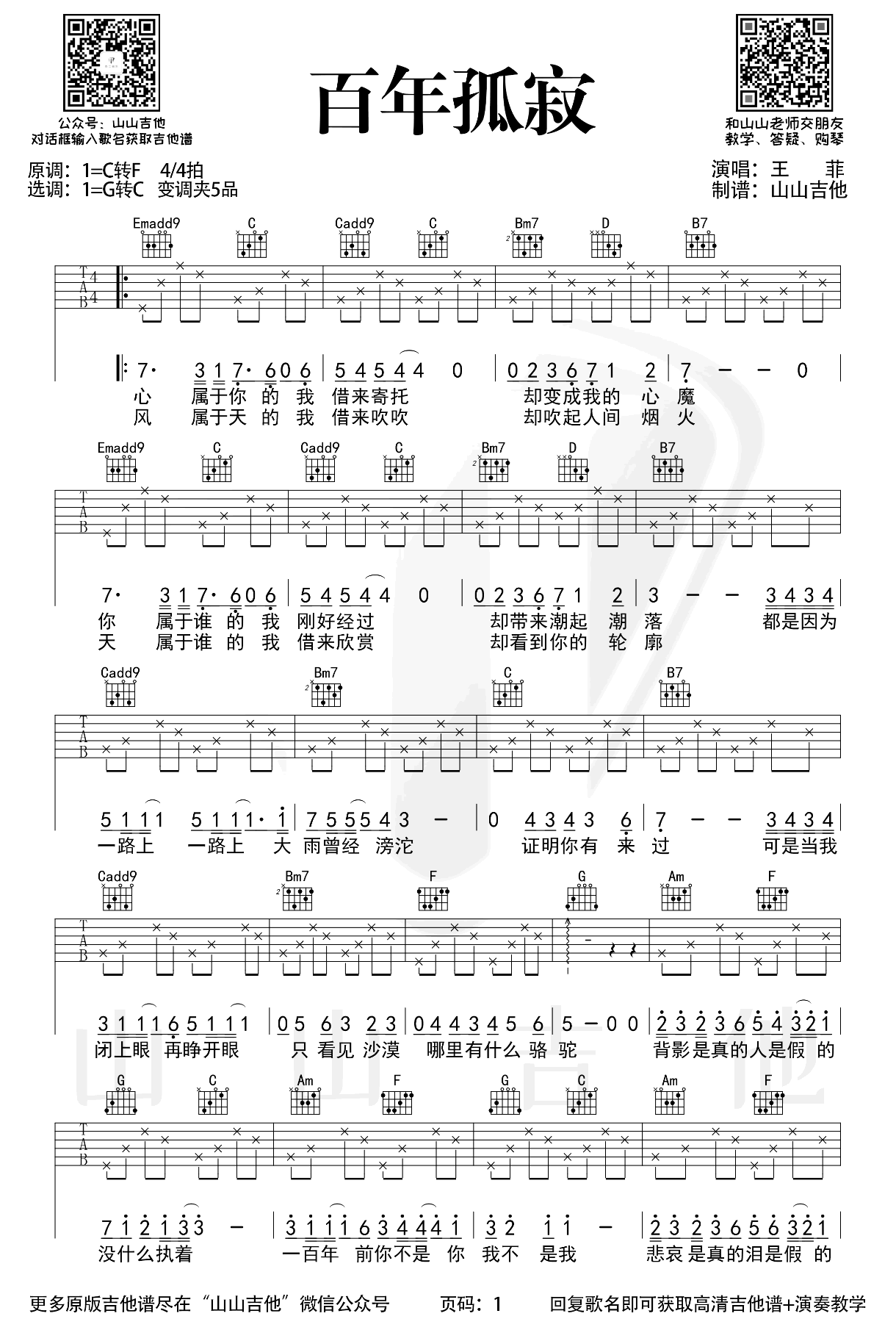 曲谱介绍: 王菲的一首老歌,最近在网络音乐平台重新翻红。百年孤寂吉他谱,原调C-F选调G-C,变调夹夹五品,共两张图片六线谱。