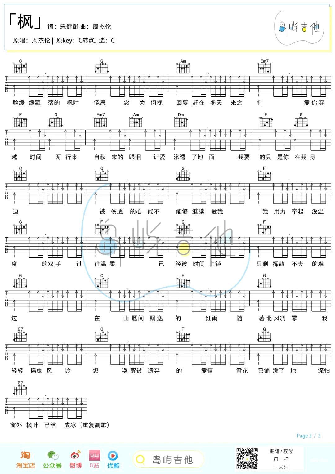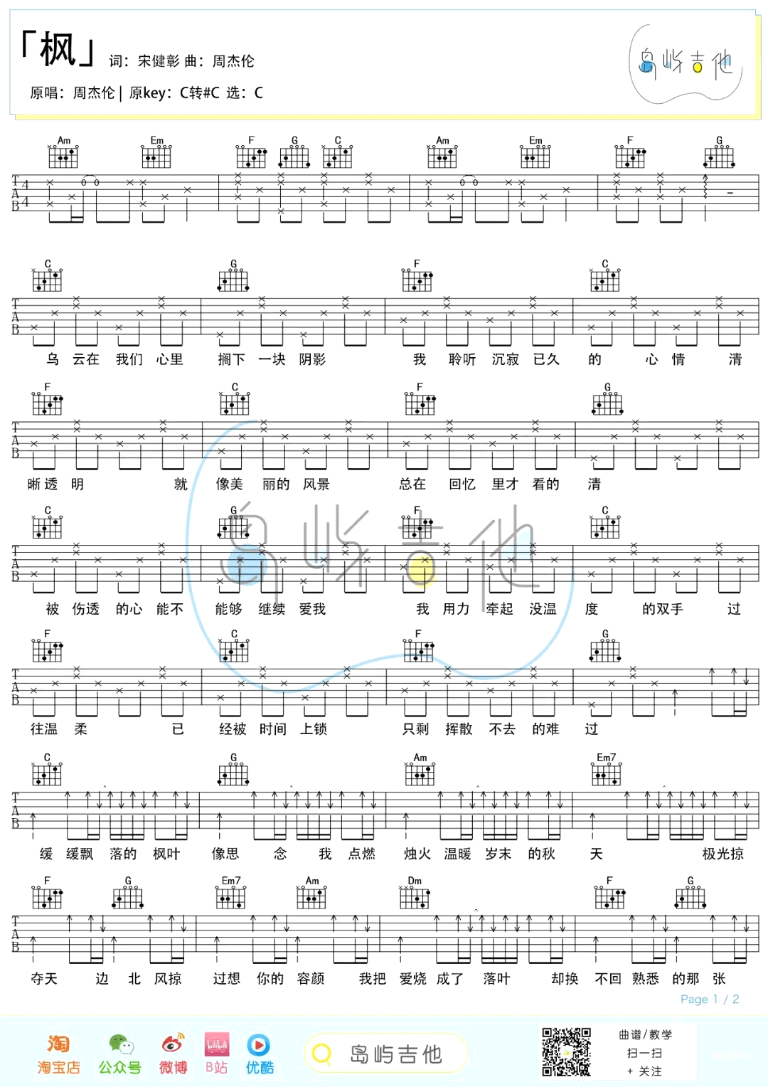 枫吉他谱 - 周杰伦 - C调吉他弹唱谱