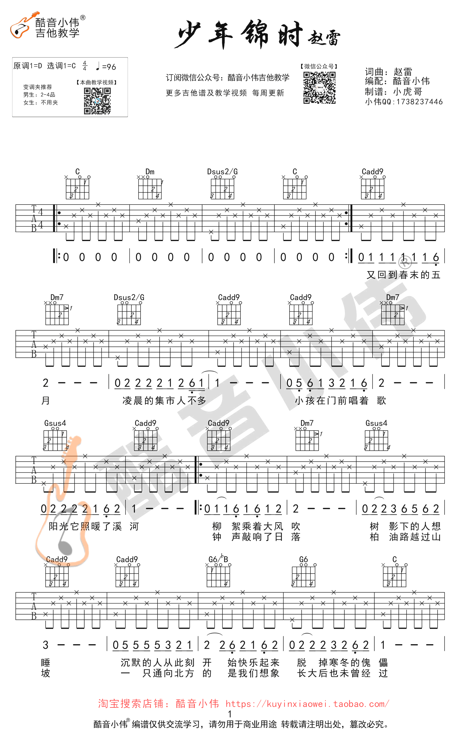 曲谱介绍: 少年锦时吉他谱,赵雷词曲原创的一首民谣歌曲,原调D选调C,变调夹推荐男生2-4品女生不用夹,原版编配共三张图片六线谱。附《少年锦时》吉他弹唱教学视频,吉他帮网站更新上传。