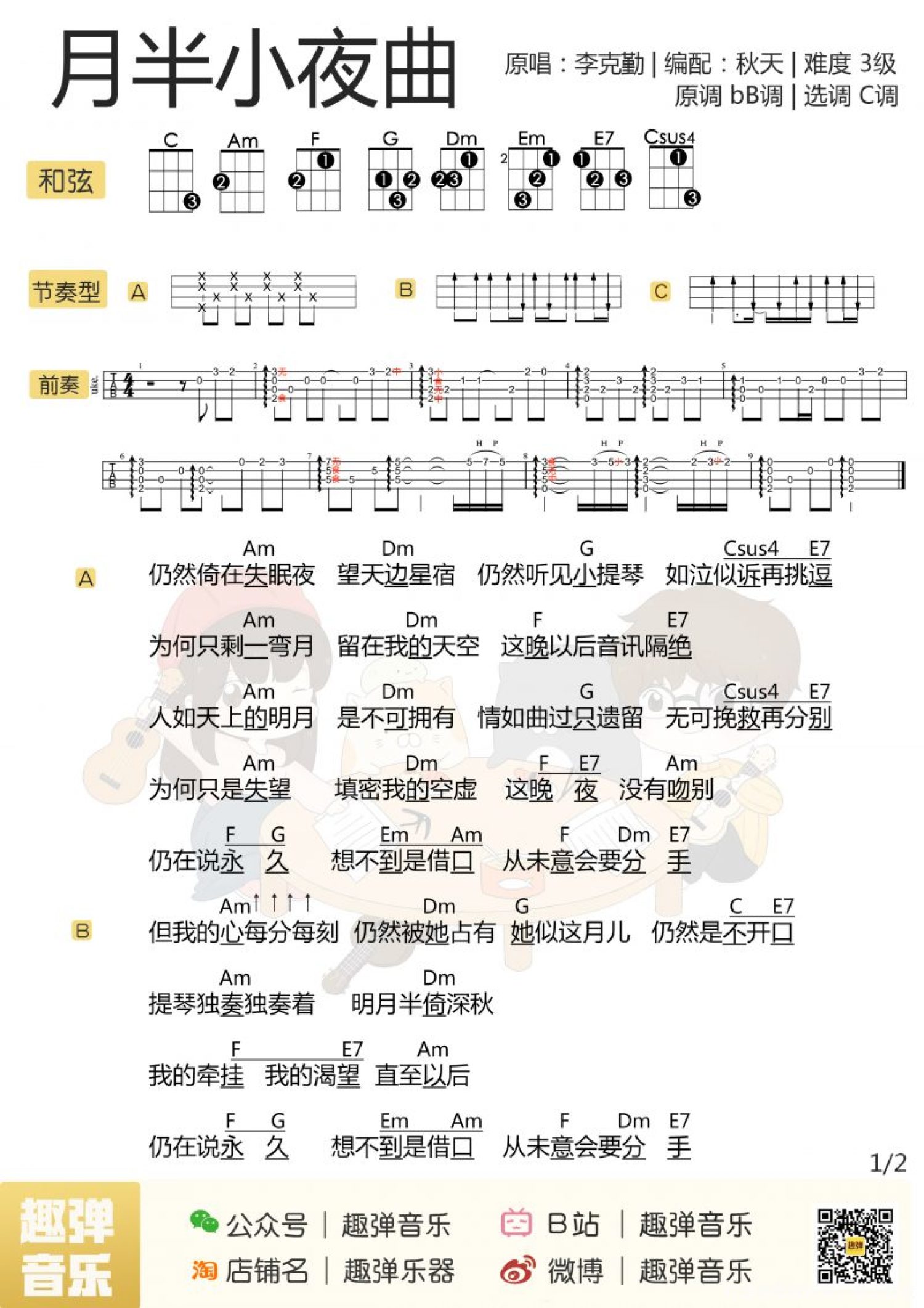 曲谱介绍: Aloha~ 今天秋天老师为大家带来的 是李克勤的经典歌「月半小夜曲」 这首老歌似乎有着一种魔力 一字一句都可以牵动人心 听过的人都会深深地爱上它 一往情深,真的越听越有味道 不知不觉就循环了一整天~   尤克里里COVER ▌ 秋天有话说 月半小夜曲是我很喜欢的一首歌,它的原版是日文歌曲《ハーフムーン·セレナーデ》,李克勤将其改编并收录在专辑《命运符号》中。 弹唱这首歌时我用了许多的节奏型,还用到了击勾弦技巧,快点打开教学视频和我一起来学这首经典情歌吧~   教学视频   弹唱曲谱