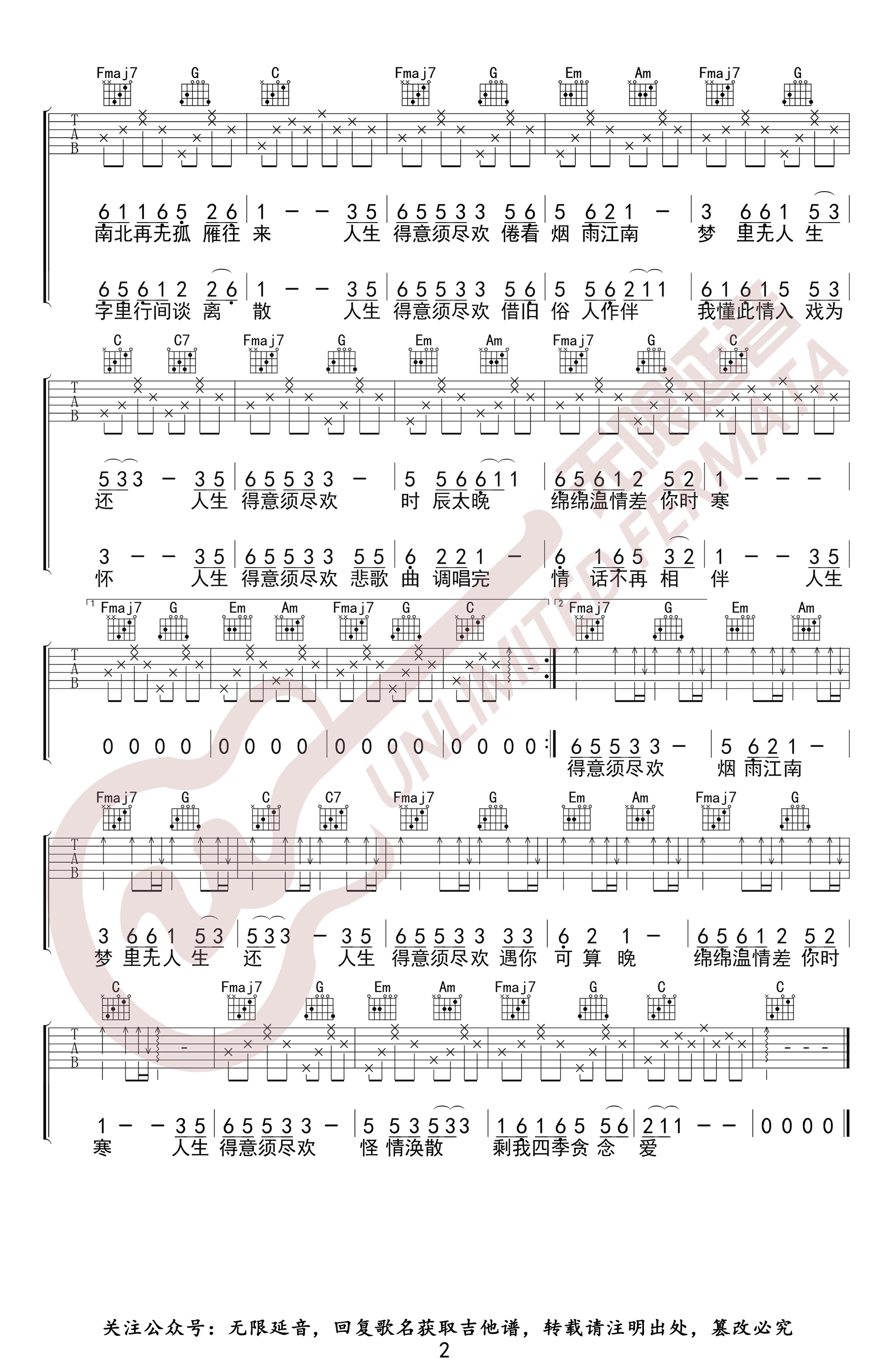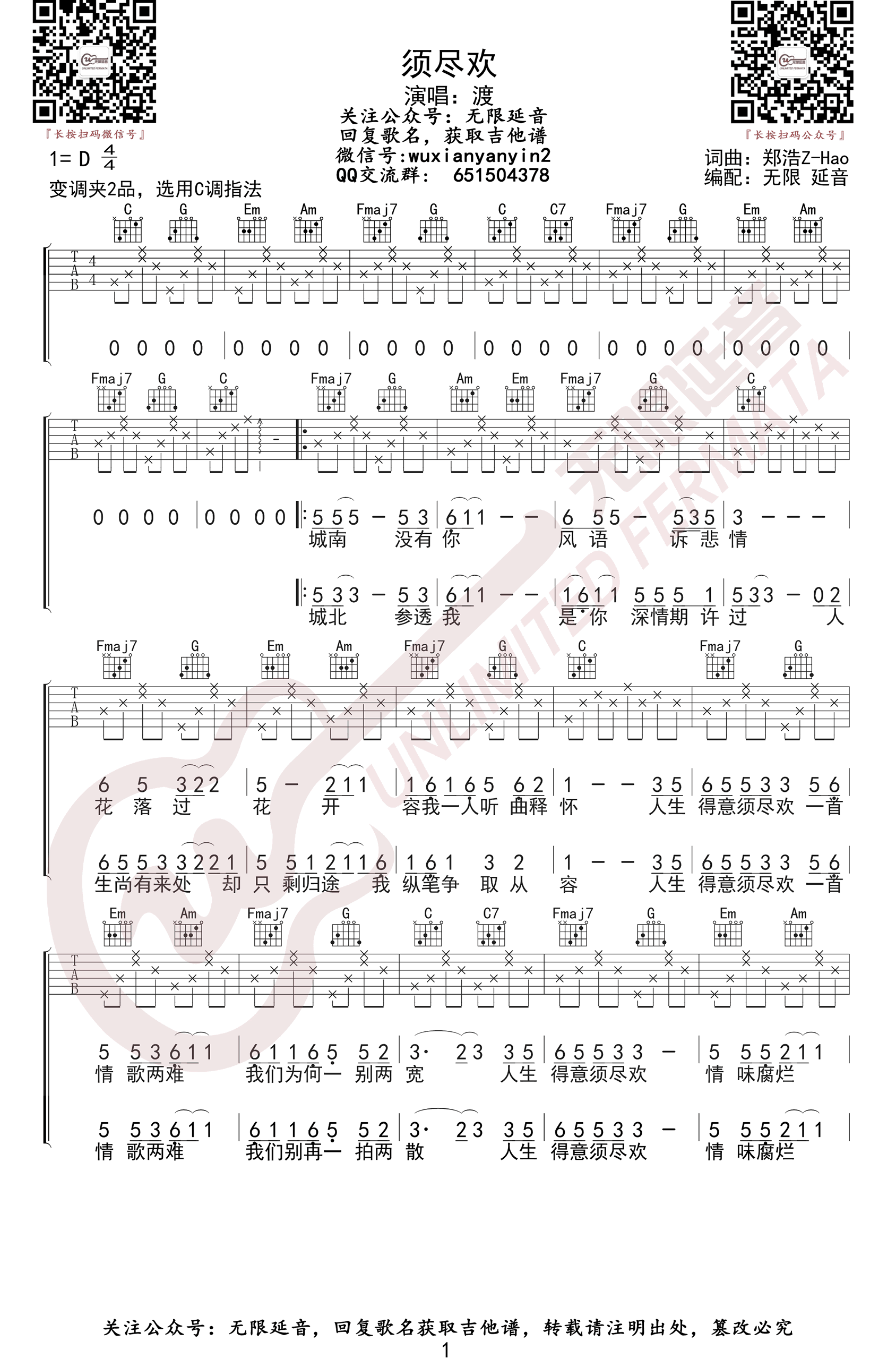 曲谱介绍: 渡演唱的一首网络热门歌曲,似写了满满的遗憾,但却让人听出一种释怀。须尽欢吉他谱,原调D,变调夹夹二品,选用C调指法,《须尽欢》吉他弹唱谱,两张高清图片六线谱。