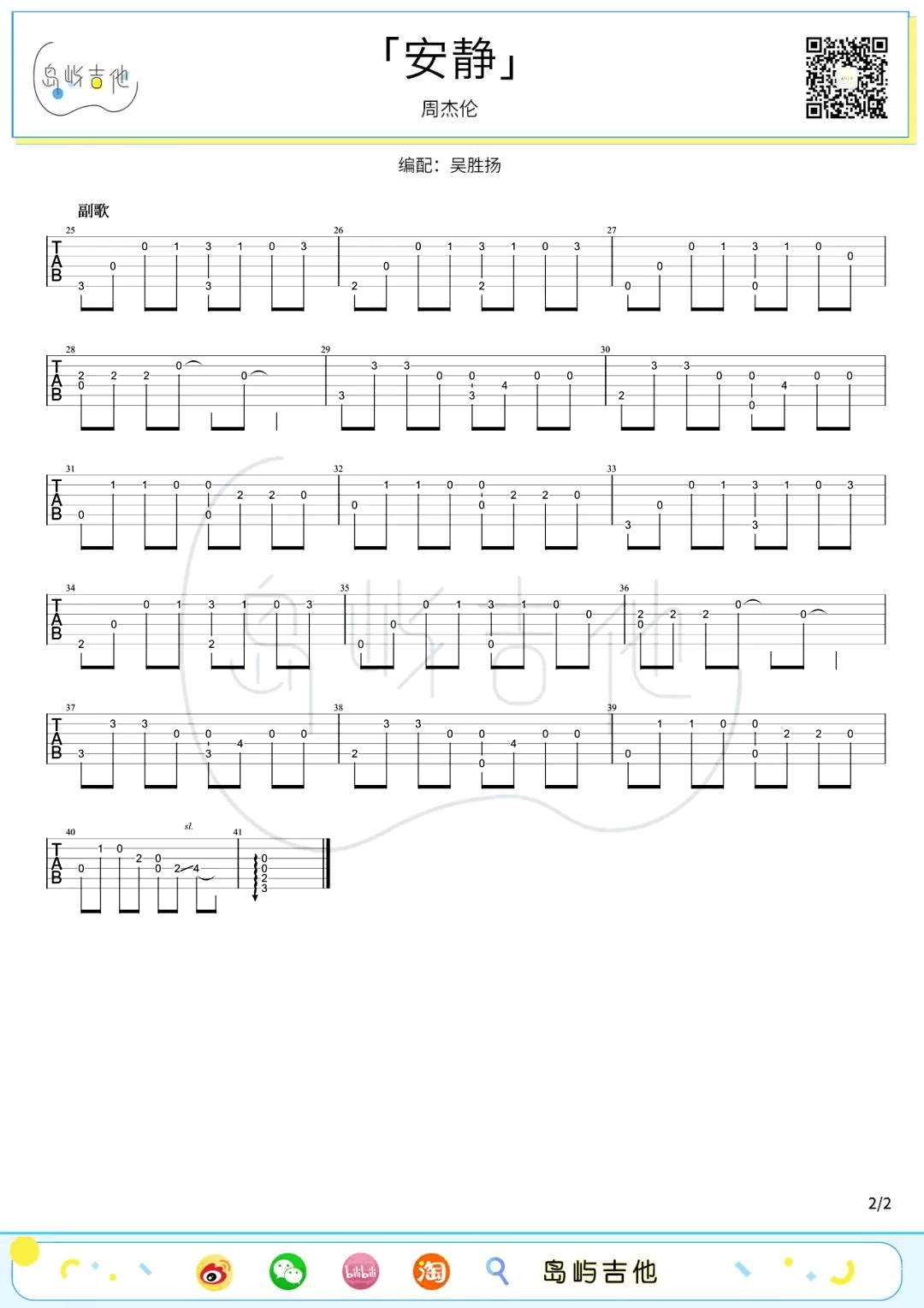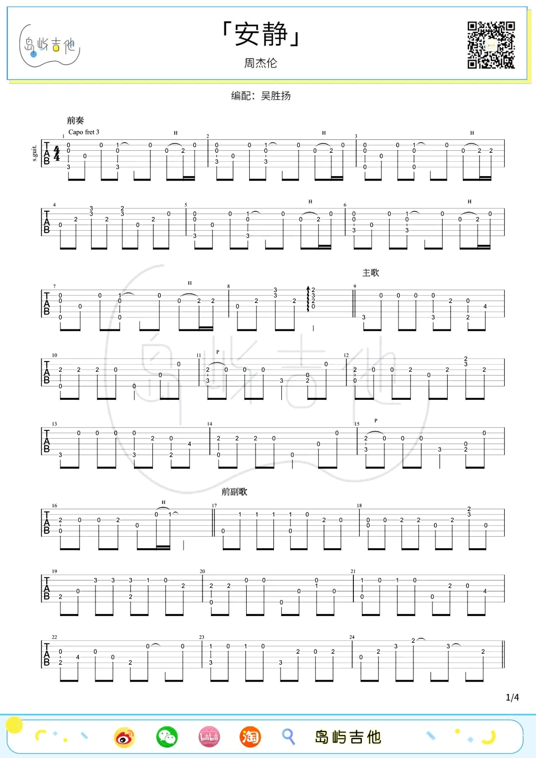 曲谱介绍: 周杰伦经典歌曲改编,安静指弹吉他谱,Capo夹三品。随谱附上《安静》吉他指弹演示和教学视频。琴友们跟随吴胜扬老师的讲解示范练习起来。
