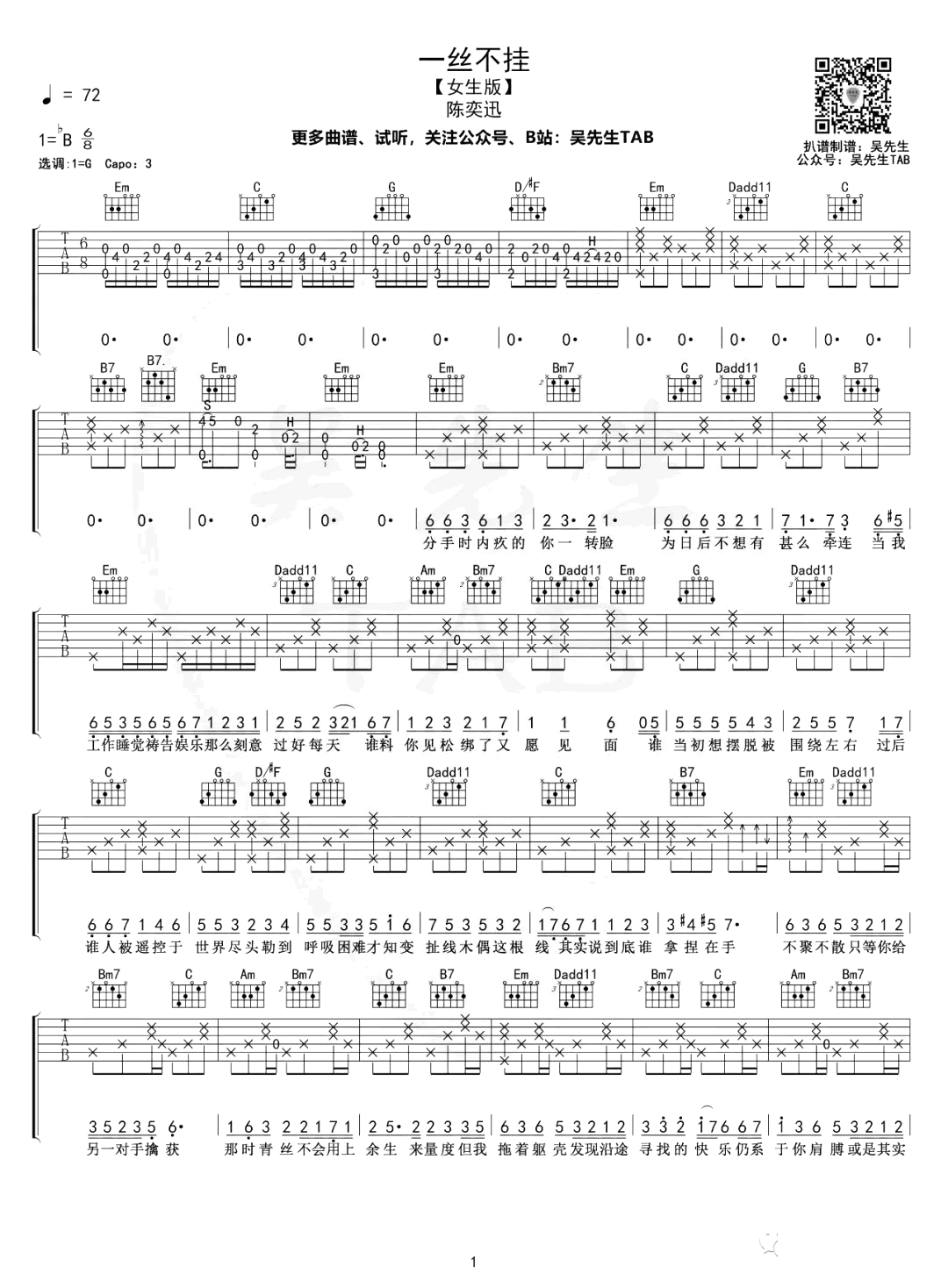 曲谱介绍: 陈奕迅的一首经典粤语歌曲,一丝不挂吉他谱,女生版编配,原调bB,选调G,Capo夹三品。《一丝不挂》吉他弹唱谱,三张图片六线谱。吉他帮更新上传。