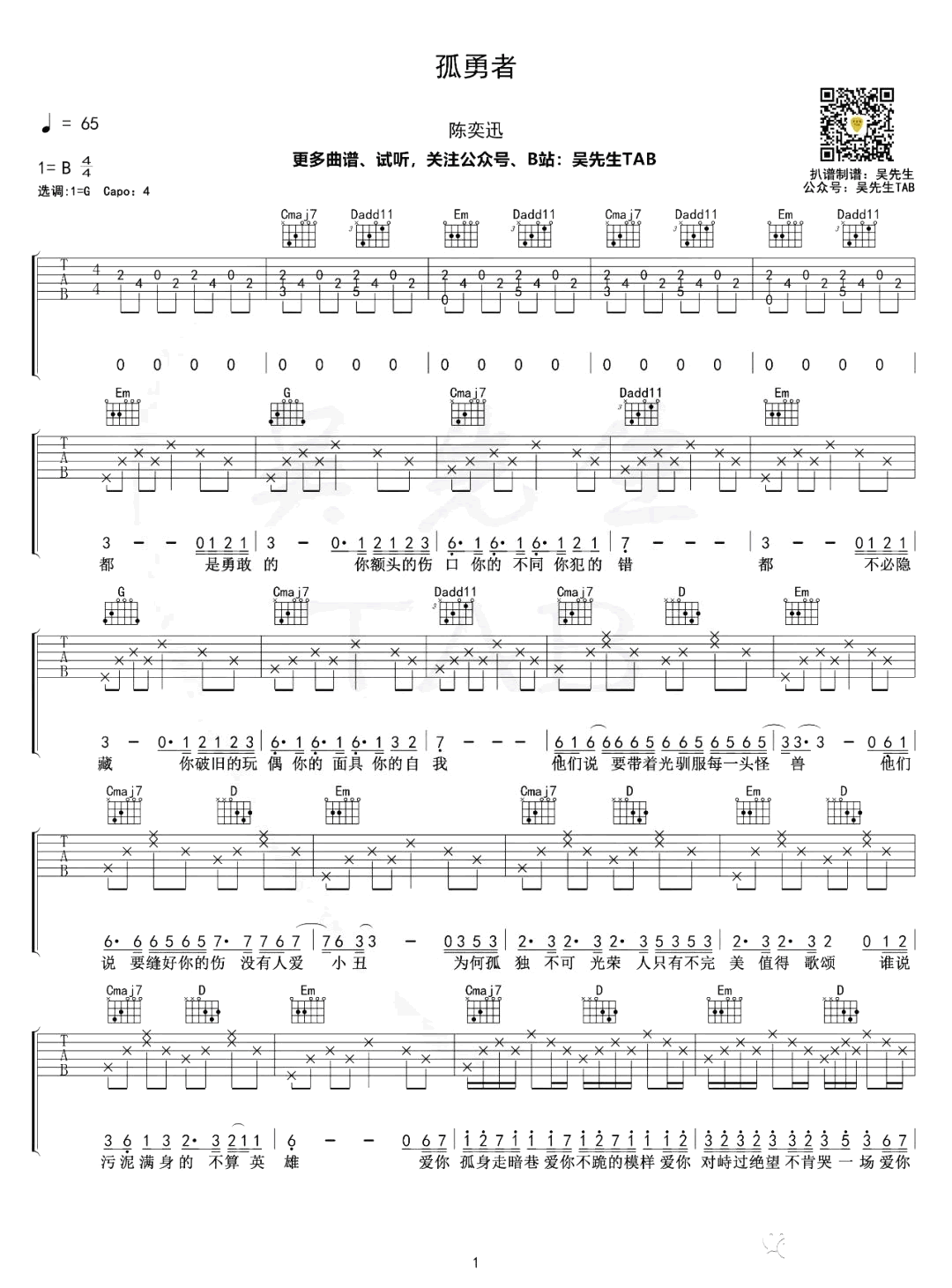 曲谱介绍: 陈奕迅的新歌,英雄联盟动画《双城之战》中文主题曲。孤勇者吉他谱,原调B选调G,Capo夹四品。《孤勇者》吉他弹唱谱,三张图片六线谱。