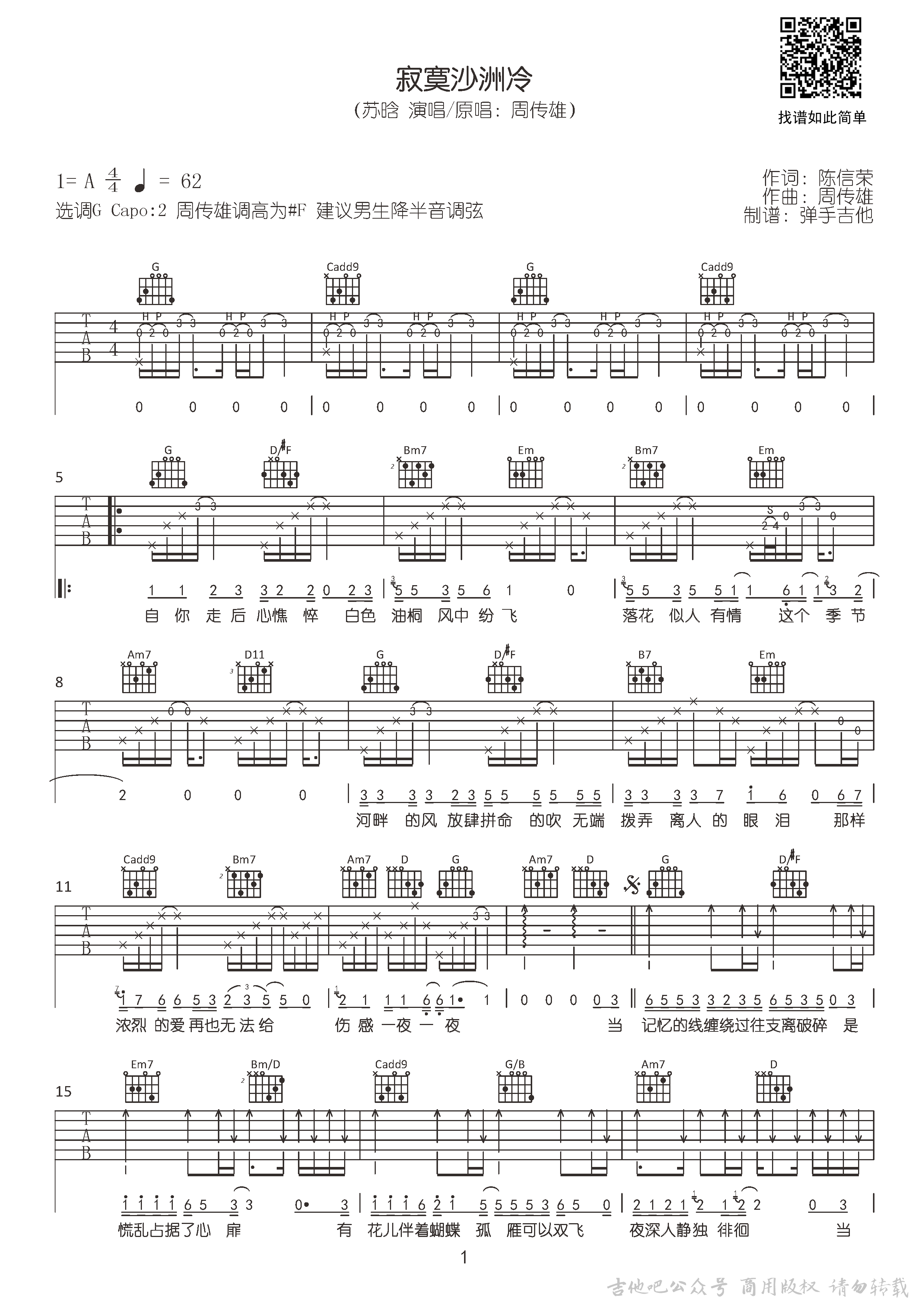 曲谱介绍: 寂寞沙洲冷吉他谱,周传雄的一首经典歌曲,苏晗女生版翻唱,歌曲原调A,选用G调指法,CAPO夹二品,完整高清图片谱共两张谱例,周传雄调高为升F,建议男生降半音调弦。温柔的吉他声撩拨出春风般的少女情怀,相比于原版的沧桑感,更添独有的天真与勇敢。爱已远走,美好的回忆却恋恋不忘,这是一份落寞,也是一份执着。