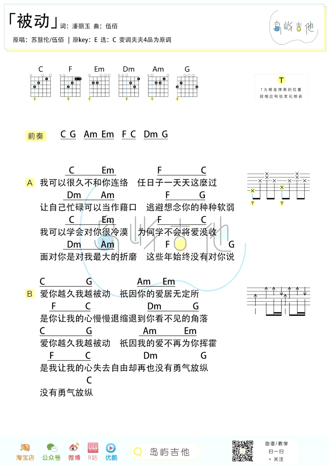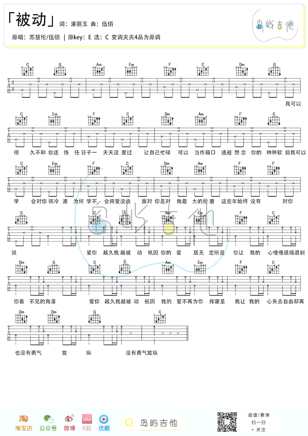 曲谱介绍: 伍佰和苏慧伦演唱的一首经典歌曲,被动吉他谱,原调E选调C,变调夹夹四品为原调,《被动》吉他弹唱谱,和弦图片+六线谱,吉他帮整理更新。