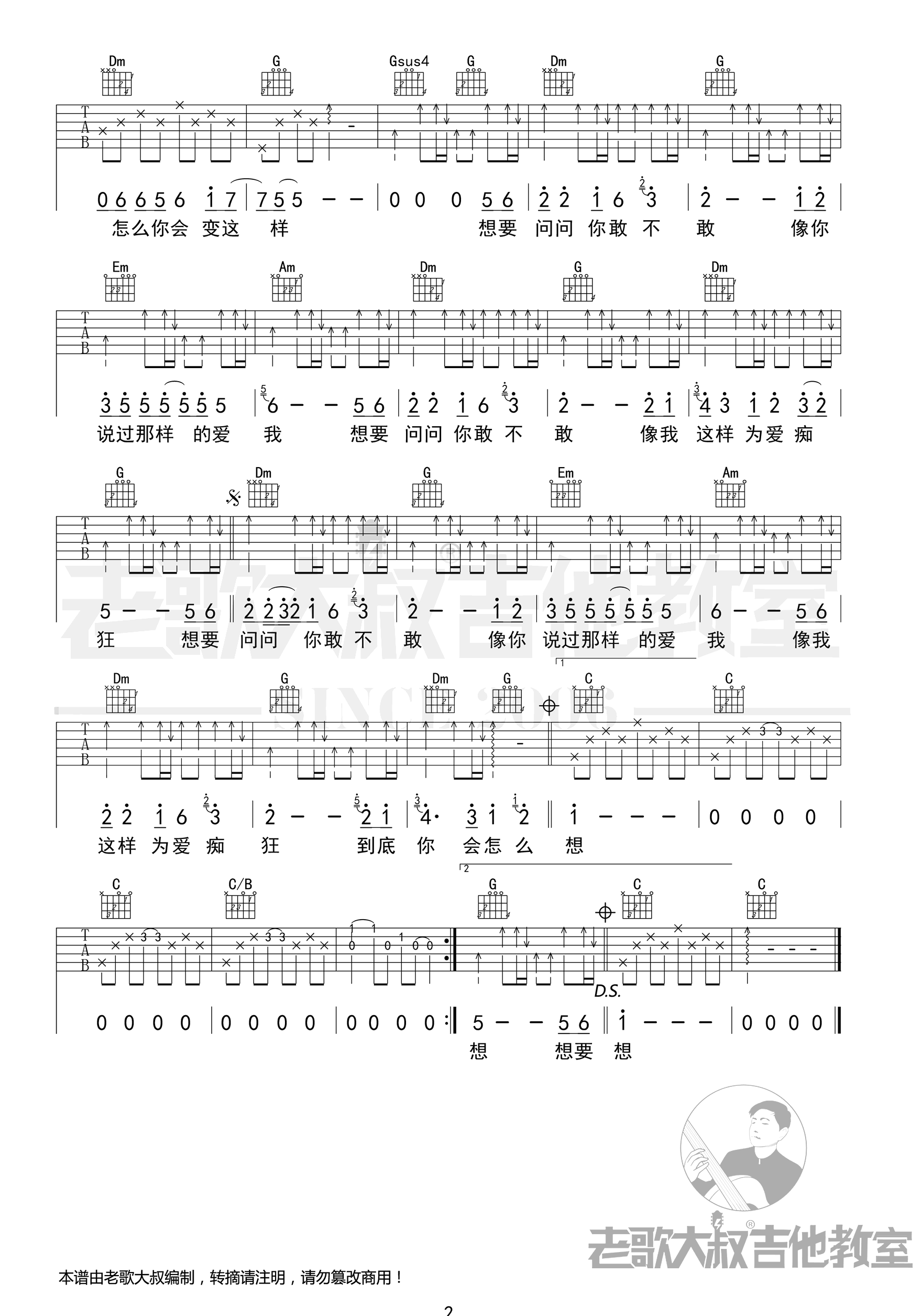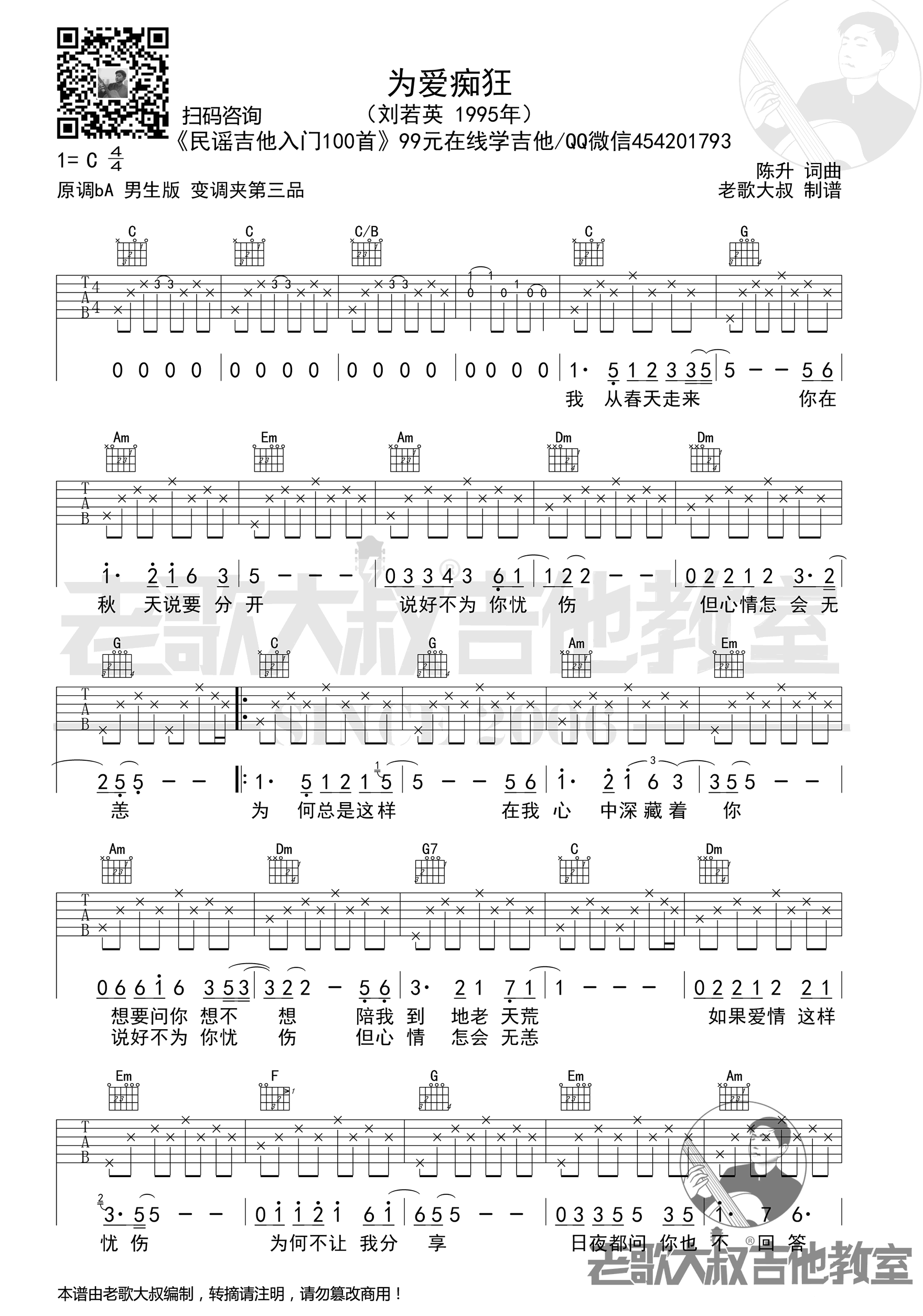 曲谱介绍: 刘若英的一首经典老歌,为爱痴狂吉他谱,男生版编配,原调bA,选用C调指法,变调夹夹第三品。《为爱痴狂》吉他弹唱谱,两张高清图片六线谱。