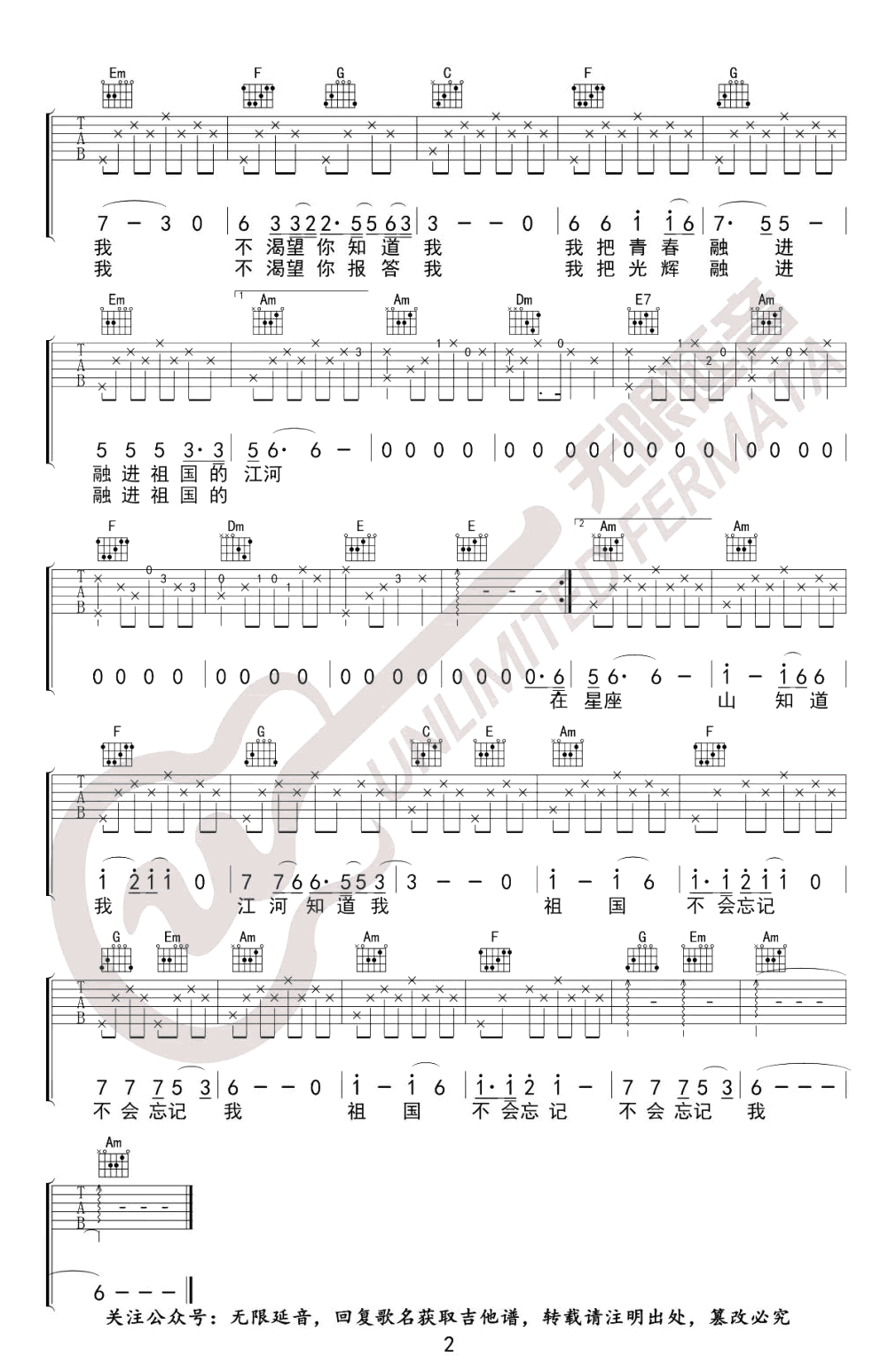 曲谱介绍: 韩红的一首经典红歌,歌颂为祖国事业默默贡献的人们。祖国不会忘记吉他谱,选用C调和弦编配,《祖国不会忘记》吉他弹唱谱,三张高清图片六线谱。吉他帮更新上传。