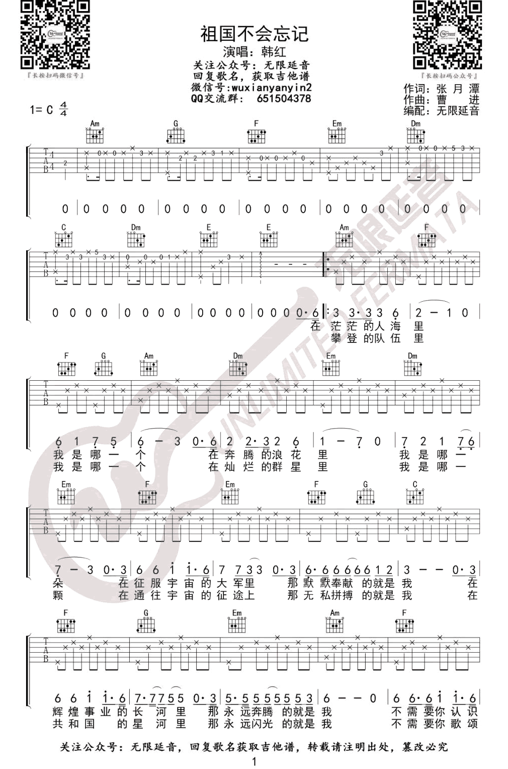 祖国不会忘记吉他谱 - 韩红 - C调吉他弹唱谱