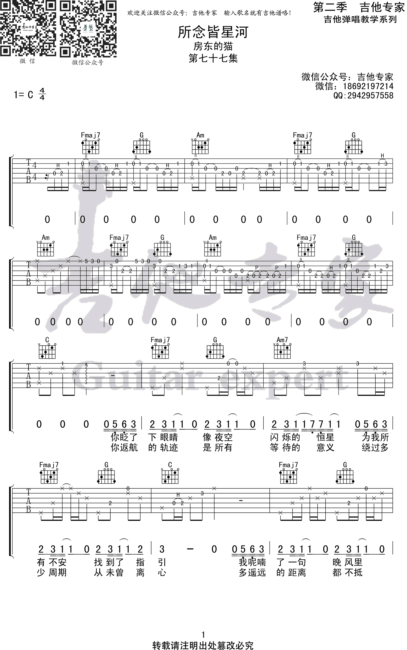 曲谱介绍: 房东的猫一首民谣创作歌曲,所念皆星河吉他谱,C调和弦指法原版编配,《所念皆星河》弹唱六线谱,共三张高清图片谱例。吉他帮上传更新。