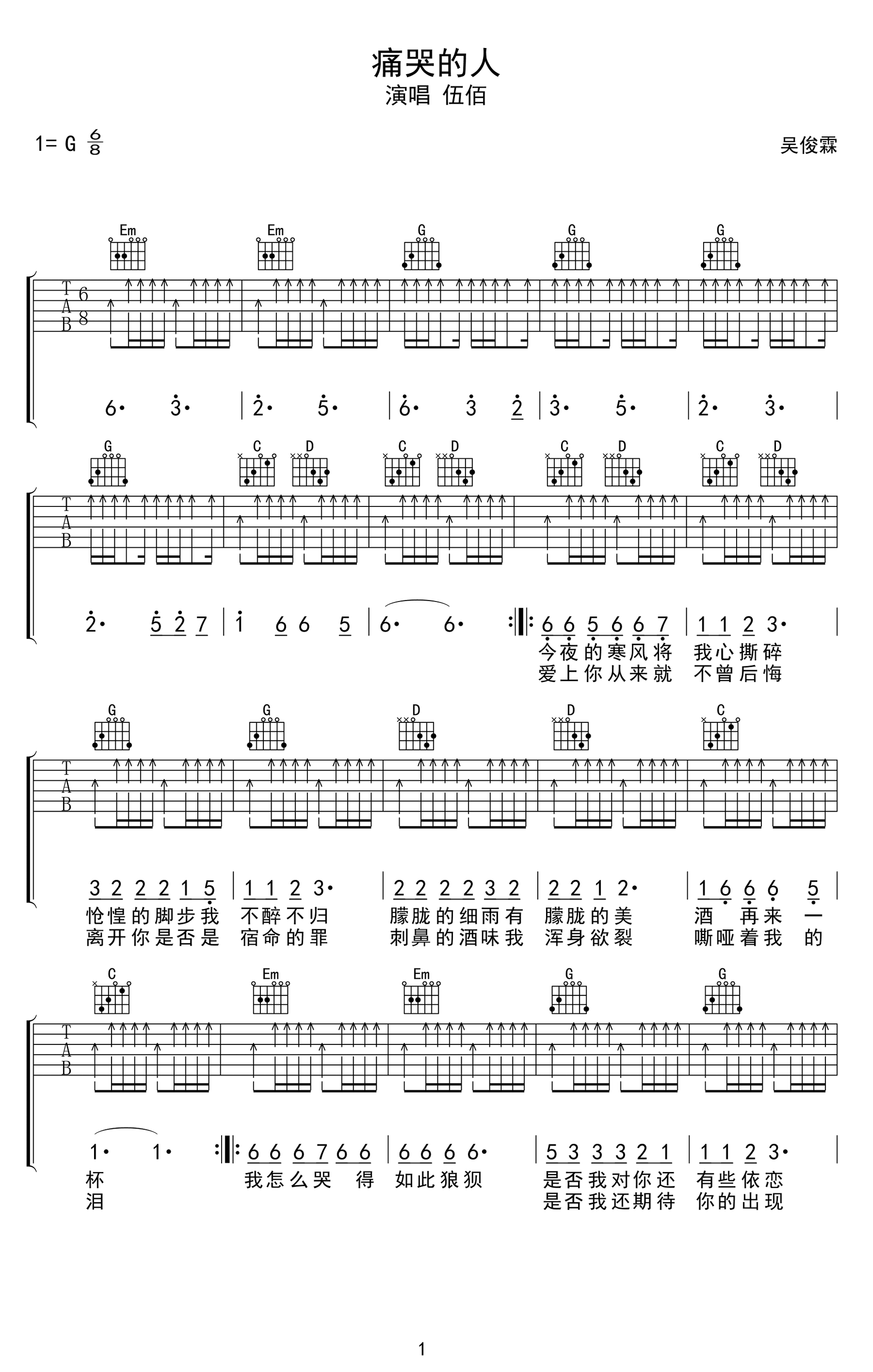 曲谱介绍: 伍佰的一首经典老歌,痛哭的人吉他谱,选用G调和弦指法,三张高清图片六线谱。《痛哭的人》吉他弹唱谱,吉他帮网站上传更新。这首歌节奏比较快,注意它的速度,不要乱了。这首歌曲整曲都是采用的同一扫弦节奏型伴奏,整体上比较的简单,而且因为是G调的和弦指法都比较的常用,喜欢的琴友可以练习起来。