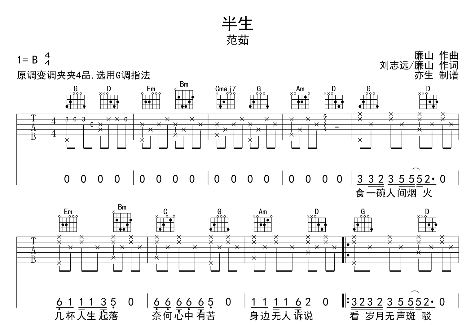 曲谱介绍: 半生吉他谱,范茹演唱的一首新歌,《半生》六线谱,共两张图片谱,本吉他谱采用G调指法编配,原调B调,节奏4/4拍,变调夹夹第4品演奏,演奏的速度控制在每分钟95拍左右,指法难度简单。