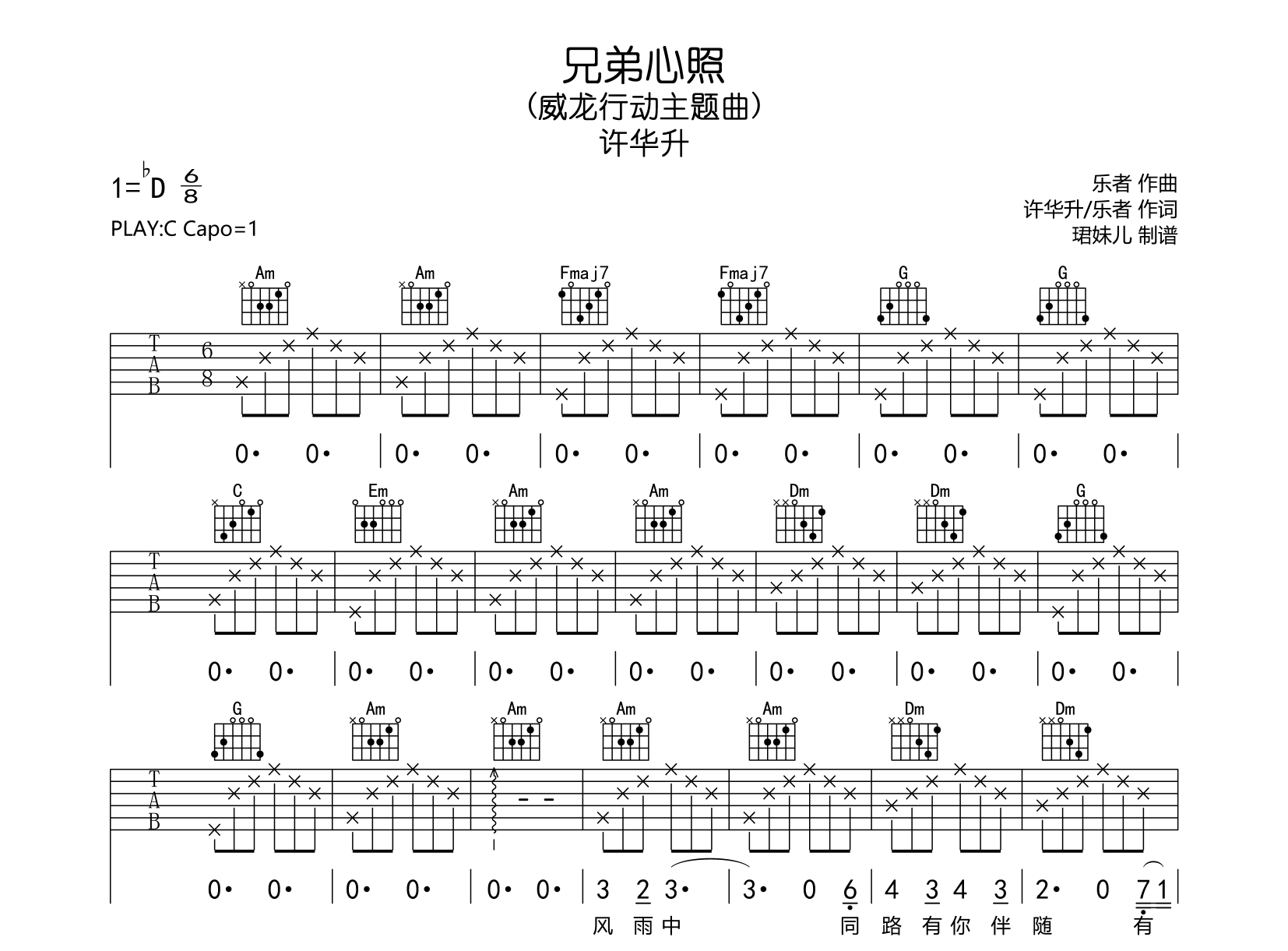 曲谱介绍: 许华升《兄弟心照》吉他谱,《威龙行动》主题曲,《兄弟心照》吉他弹唱谱,共有两张图片谱,本谱采用C调指法编配,原调bD,弹唱建议变调夹1品,速度95BPM,节奏6/8拍,难度较简单,易上手,本谱由@珺妹儿制谱。