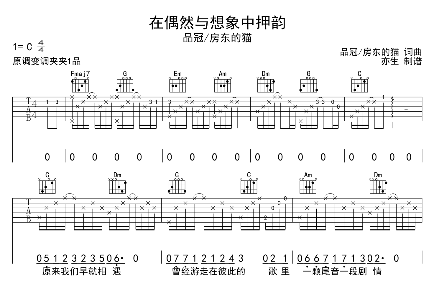 曲谱介绍: 在偶然与想象中押韵吉他谱,品冠/房东的猫演唱的一首歌曲,《在偶然与想象中押韵》六线谱,共有两张图片谱,本吉他谱采用C调指法编配,原调#C,节奏4/4拍,变调夹夹第1品演奏,演奏的速度控制在每分钟95拍左右,指法难度简单,本谱由@亦生制谱。