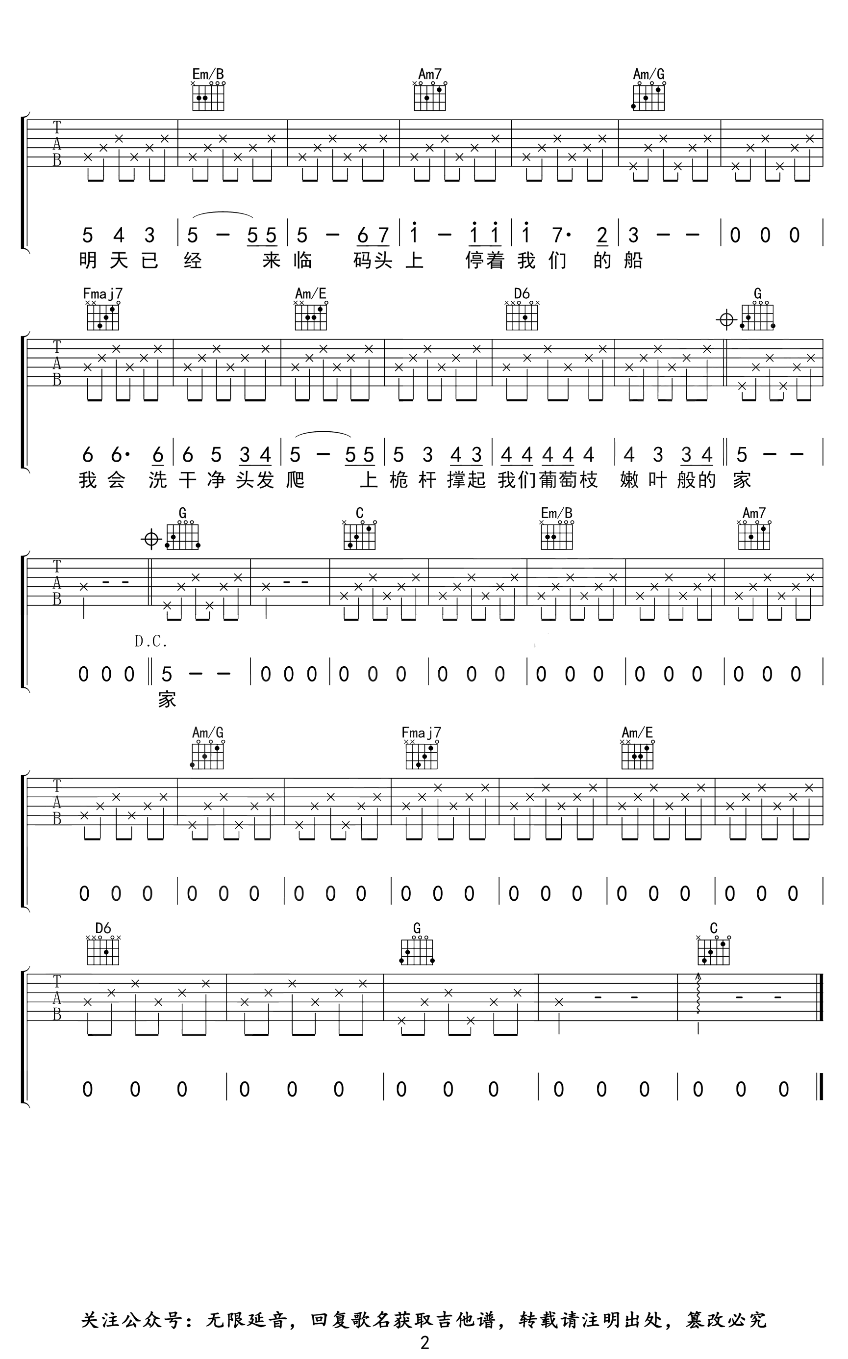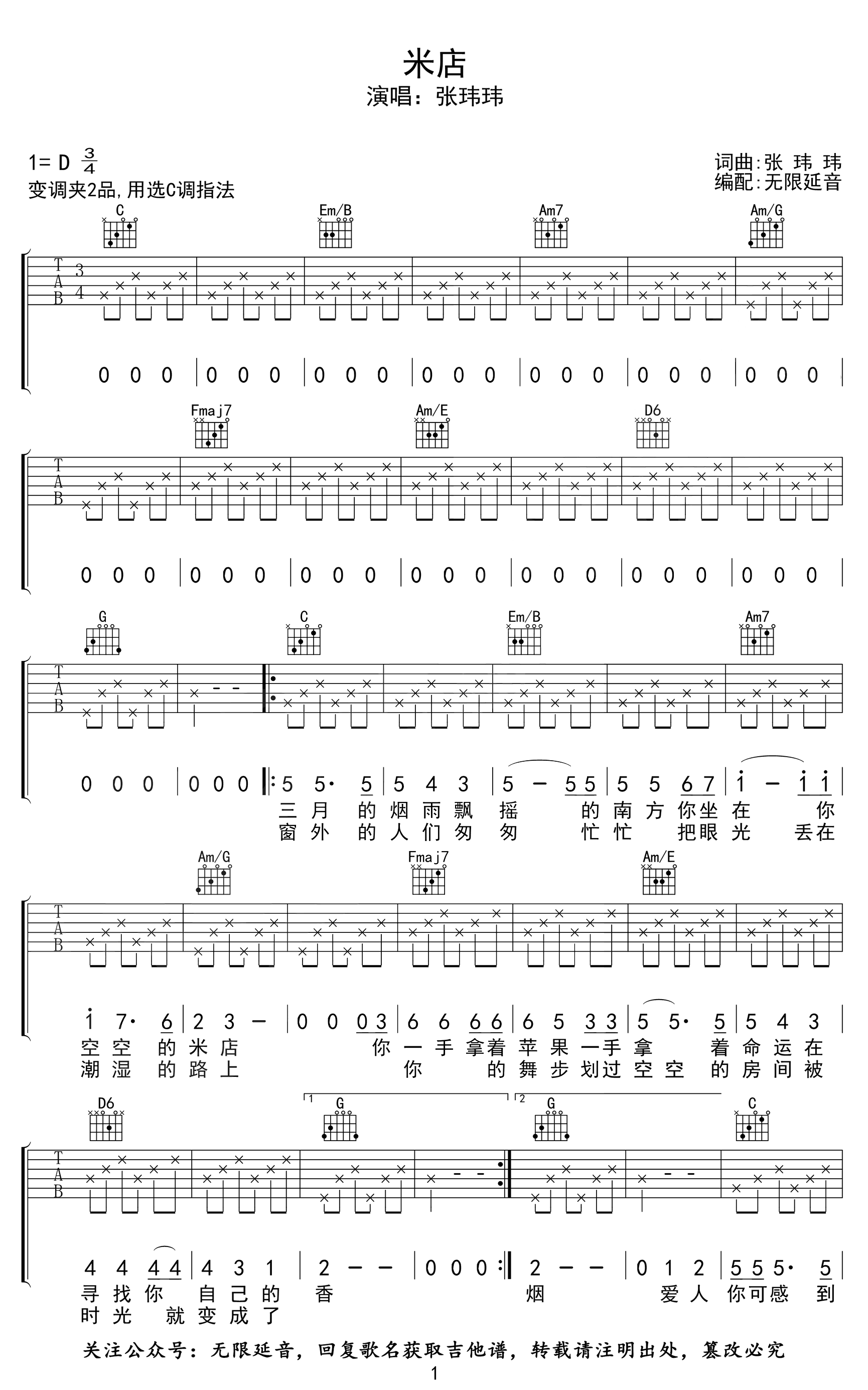 曲谱介绍: 《米店》吉他弹唱谱,原调D,选用C调指法,带前奏编配,变调夹夹二品,六线谱共两张高清图片。
