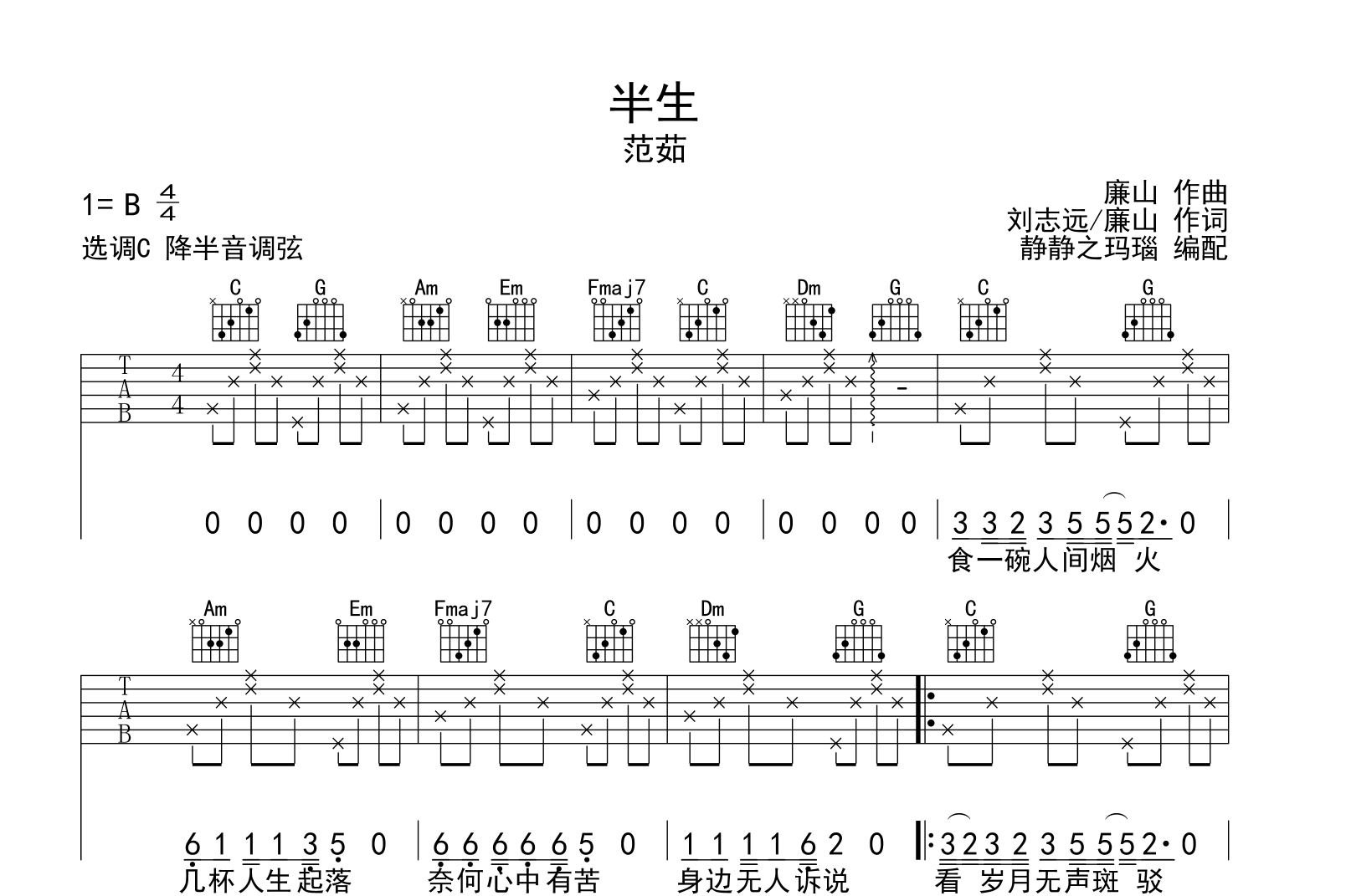 曲谱介绍: 范茹《半生》吉他谱,由@静静之玛瑙制谱,《半生》六线谱,共两张图片谱,本谱采用C调和弦指法编配,原调B调,节奏4/4拍,曲速85拍每分钟,弹唱建议降半音调弦,指法简单。