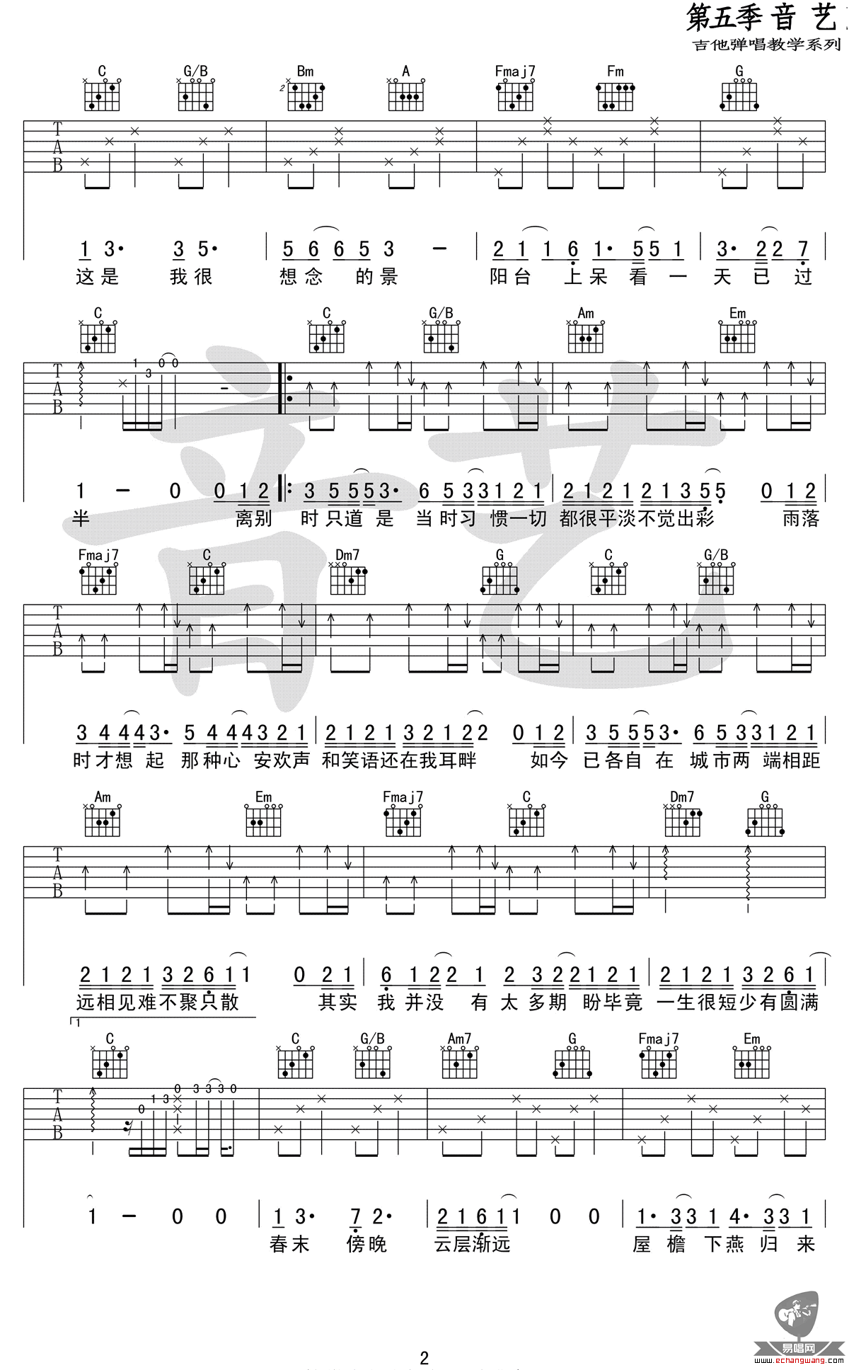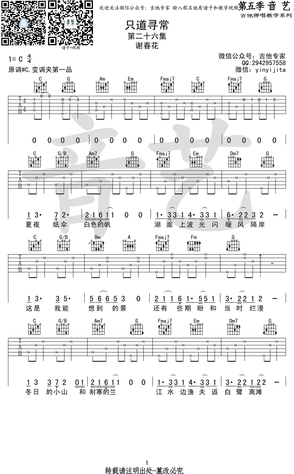 曲谱介绍: 谢春花《只道寻常》吉他弹唱谱,采用C调指法编配,共有2张高清图谱,免翻页排版设计。