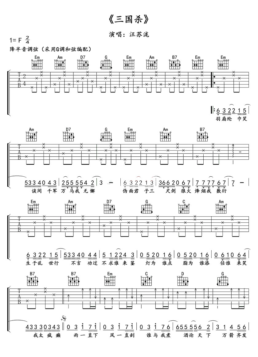 曲谱介绍: 汪苏泷《三国杀》吉他弹唱谱,采用G调指法编配,共有2张高清图谱,免翻页排版设计。