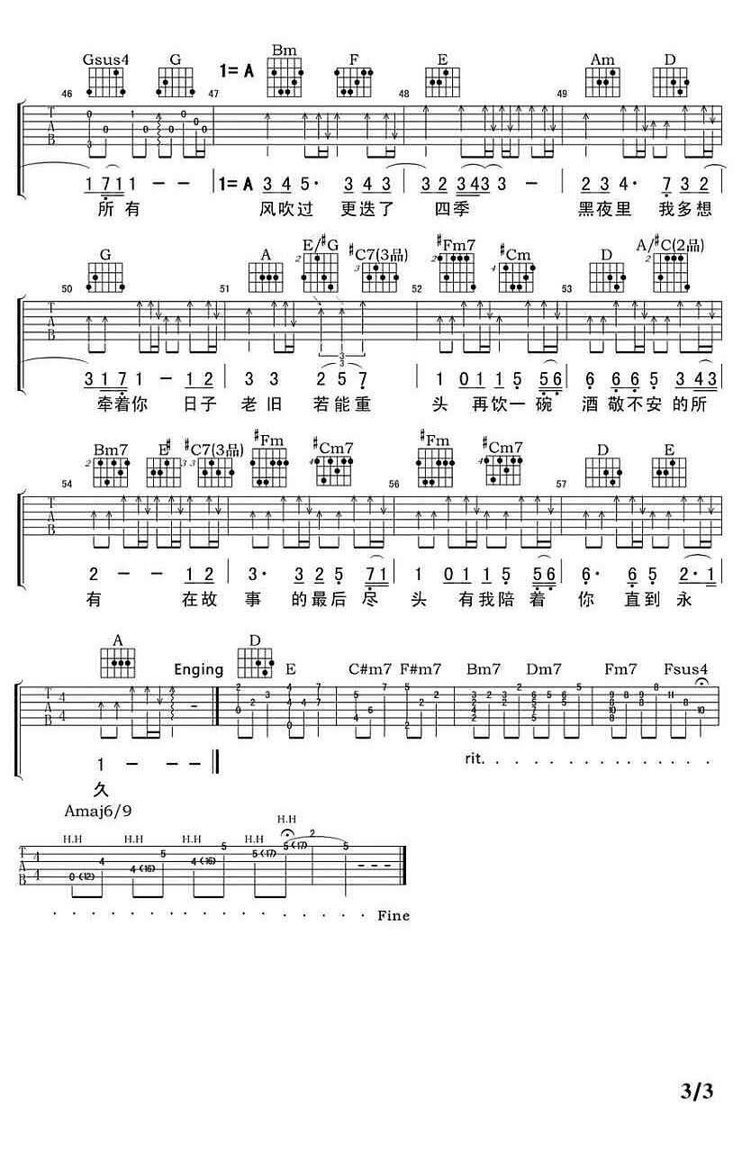 曲谱介绍: 栗先达《相守》吉他弹唱谱,采用G调指法编配原版,共有3张高清图谱。
