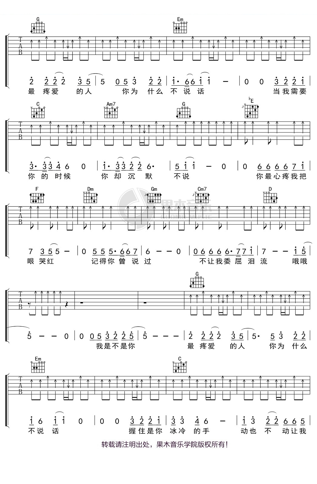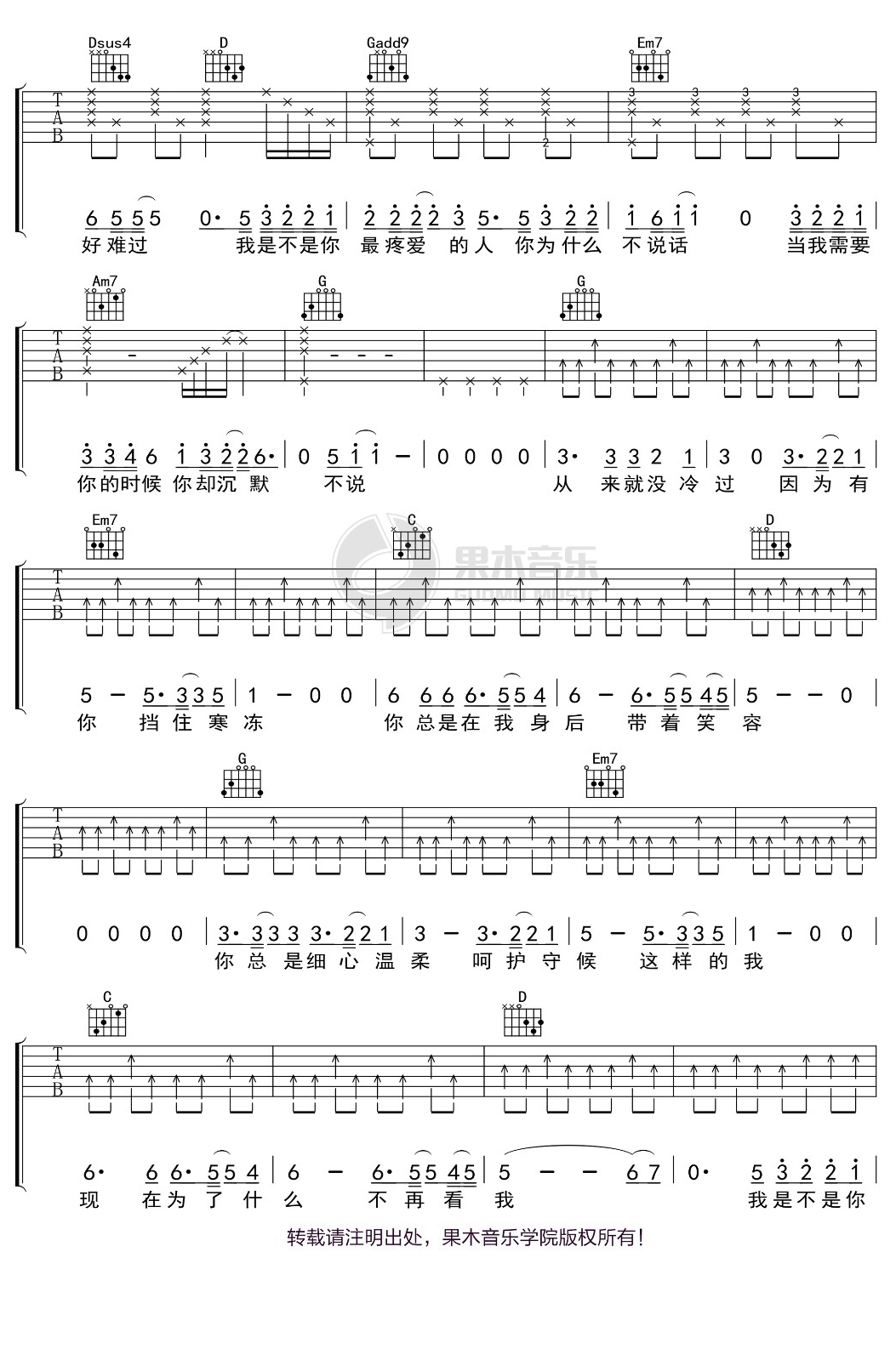 曲谱介绍: 李代沫/潘越云《我是不是你最疼爱的人》吉他弹唱谱,采用G调指法编配原版,共有4张高清图谱。