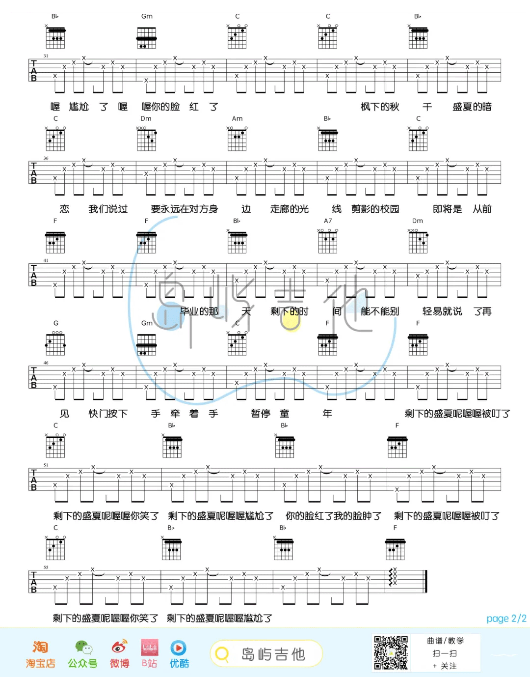 曲谱介绍: TFboys《剩下的盛夏》吉他弹唱谱,采用F调指法编配,共有2张高清图谱,免翻页排版设计。