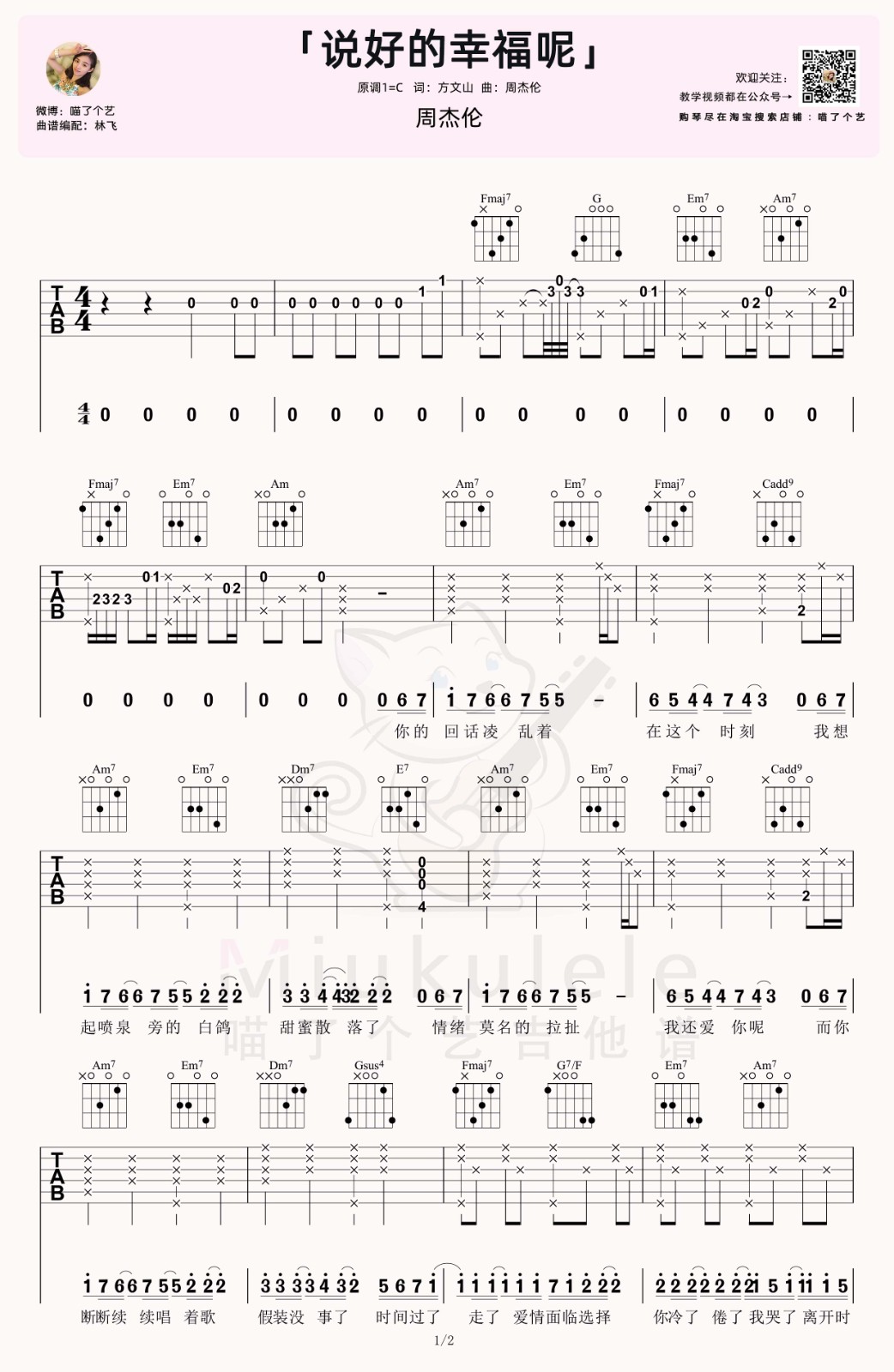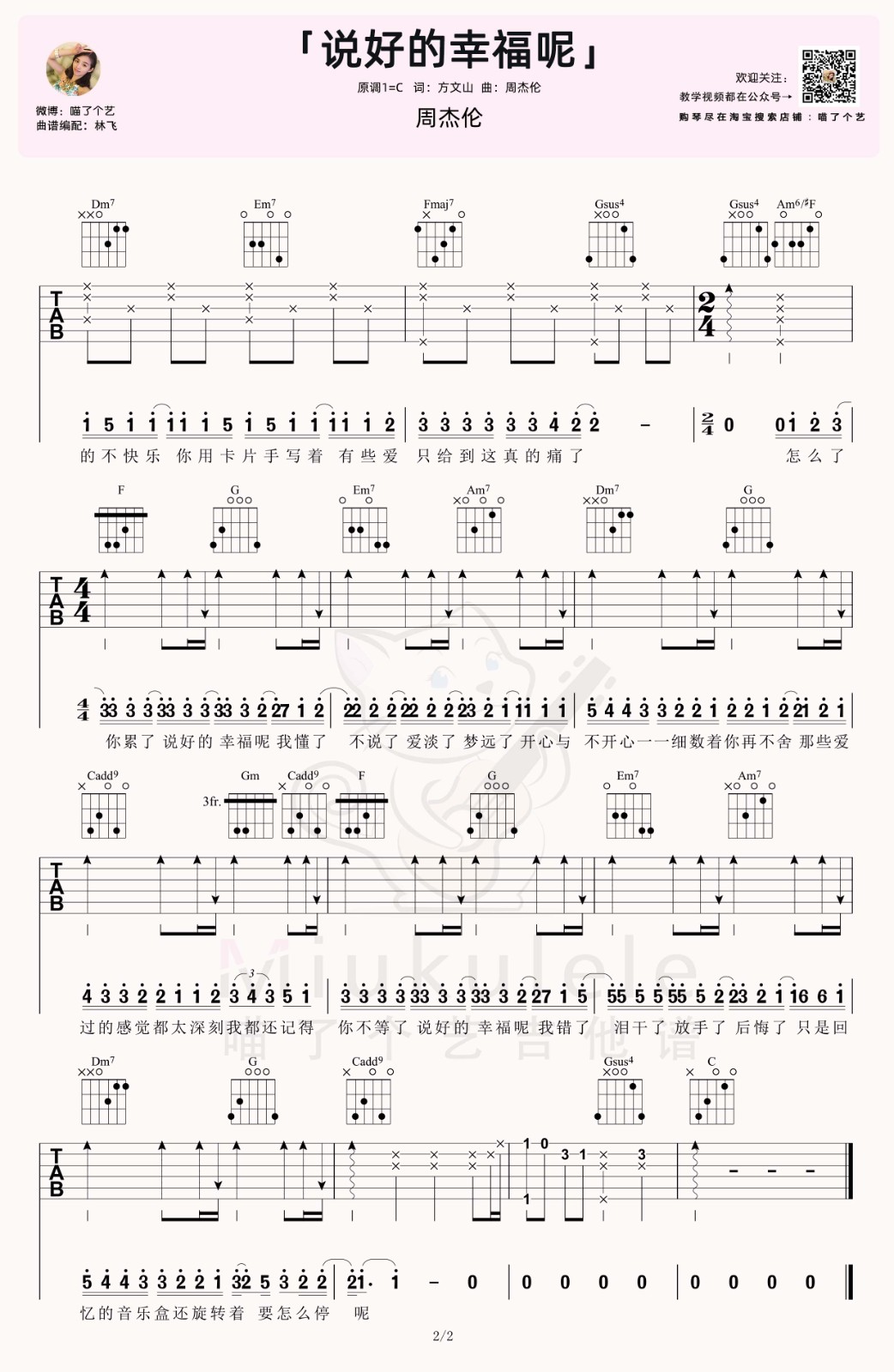 曲谱介绍: 周杰伦《说好的幸福呢》吉他弹唱谱,采用C调指法编配,共有2张高清图谱,免翻页排版设计。