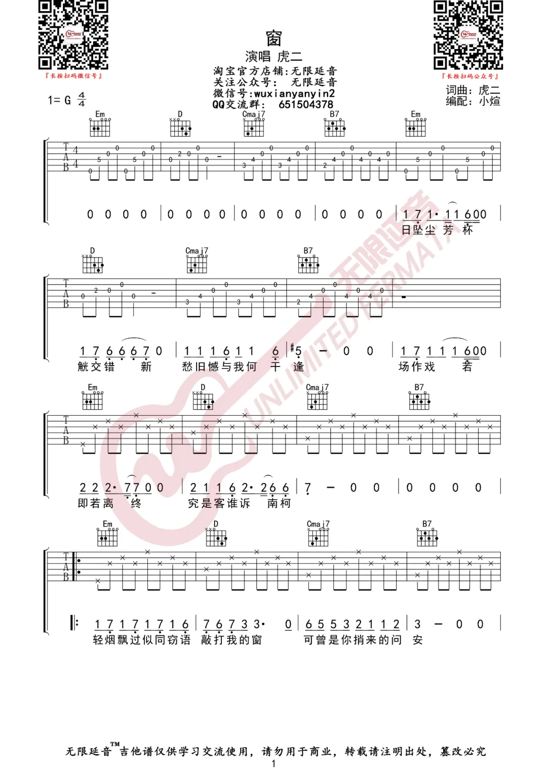 曲谱介绍: 虎二《窗》吉他弹唱谱,采用G调指法编配原版,共有3张高清图谱。