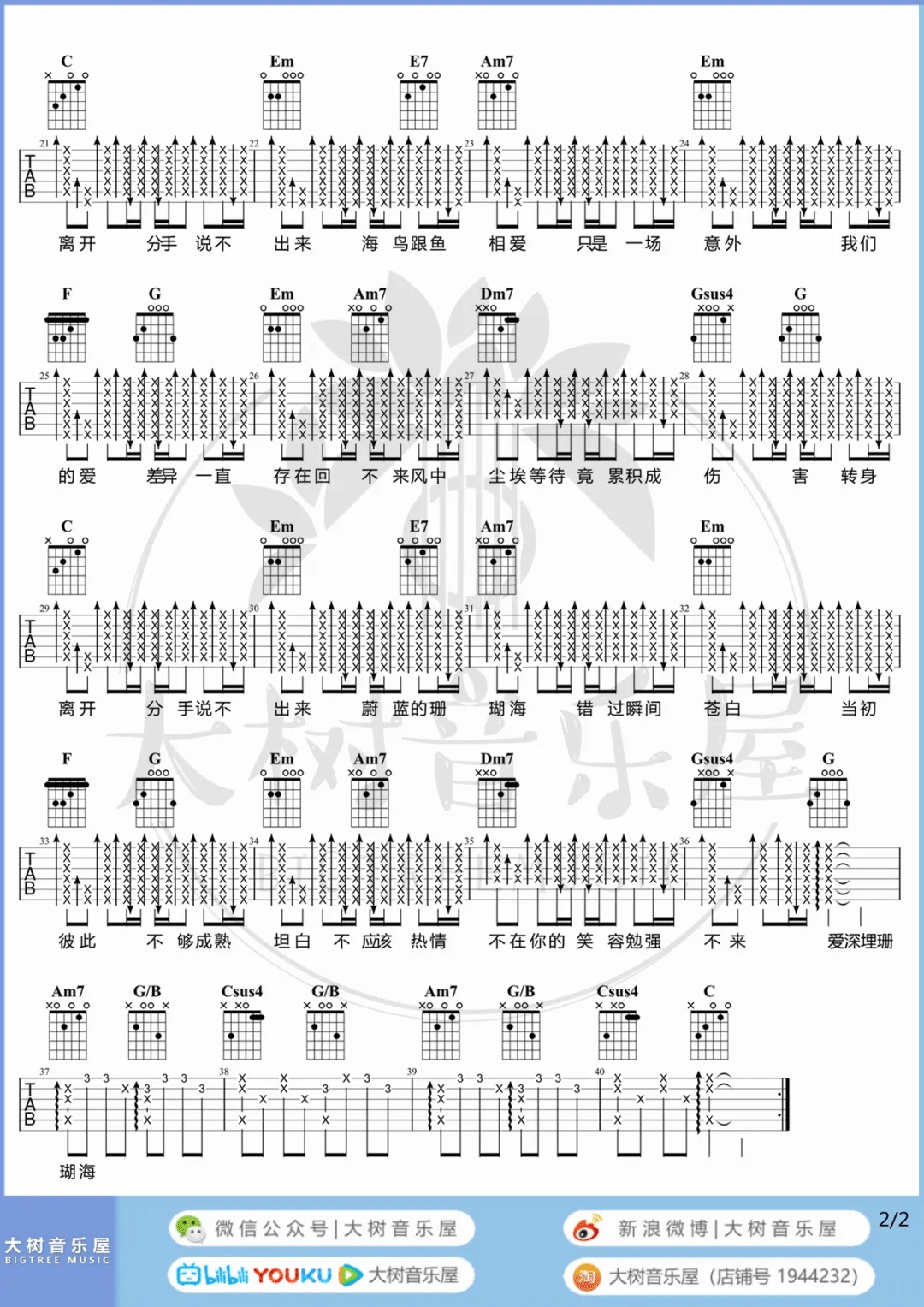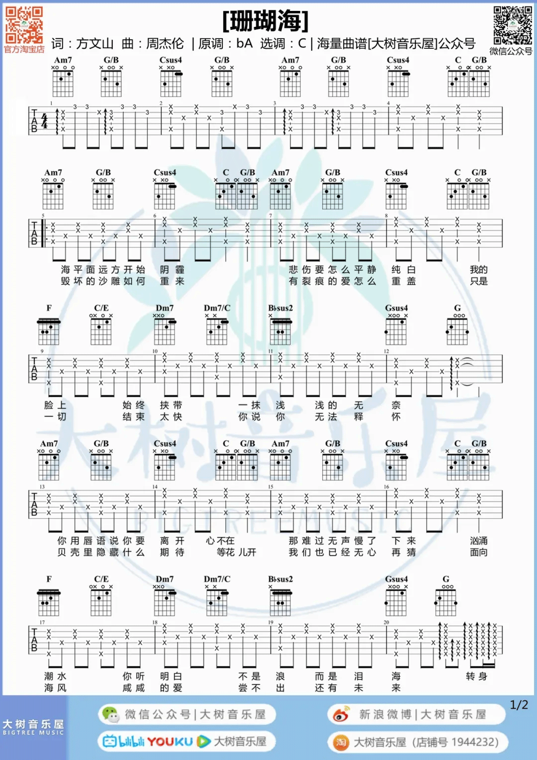 曲谱介绍: 周杰伦/梁心颐《珊瑚海》吉他弹唱谱,采用C调指法编配,共有2张高清图谱,免翻页排版设计。
