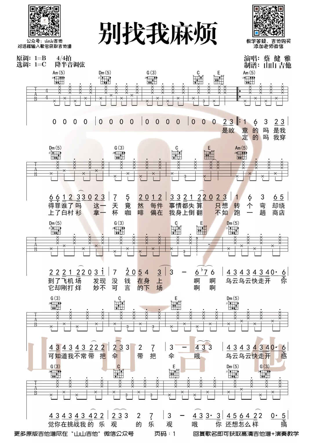 曲谱介绍: 蔡健雅《别找我麻烦》吉他弹唱谱,采用C调指法编配原版,共有2张高清图谱,免翻页排版设计。