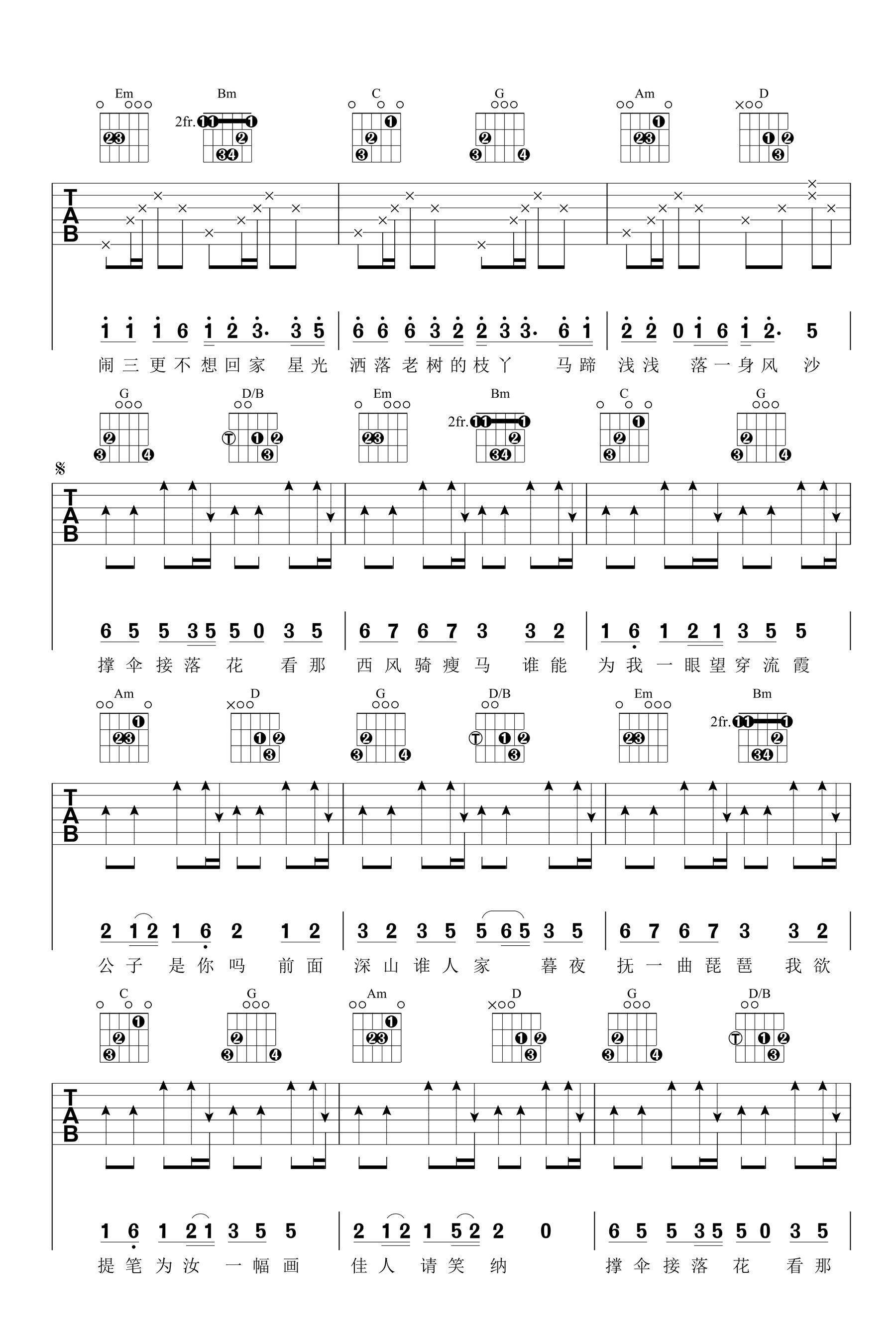 曲谱介绍: 花僮《笑纳》吉他弹唱谱,采用G调指法编配原版,共有4张高清图谱。
