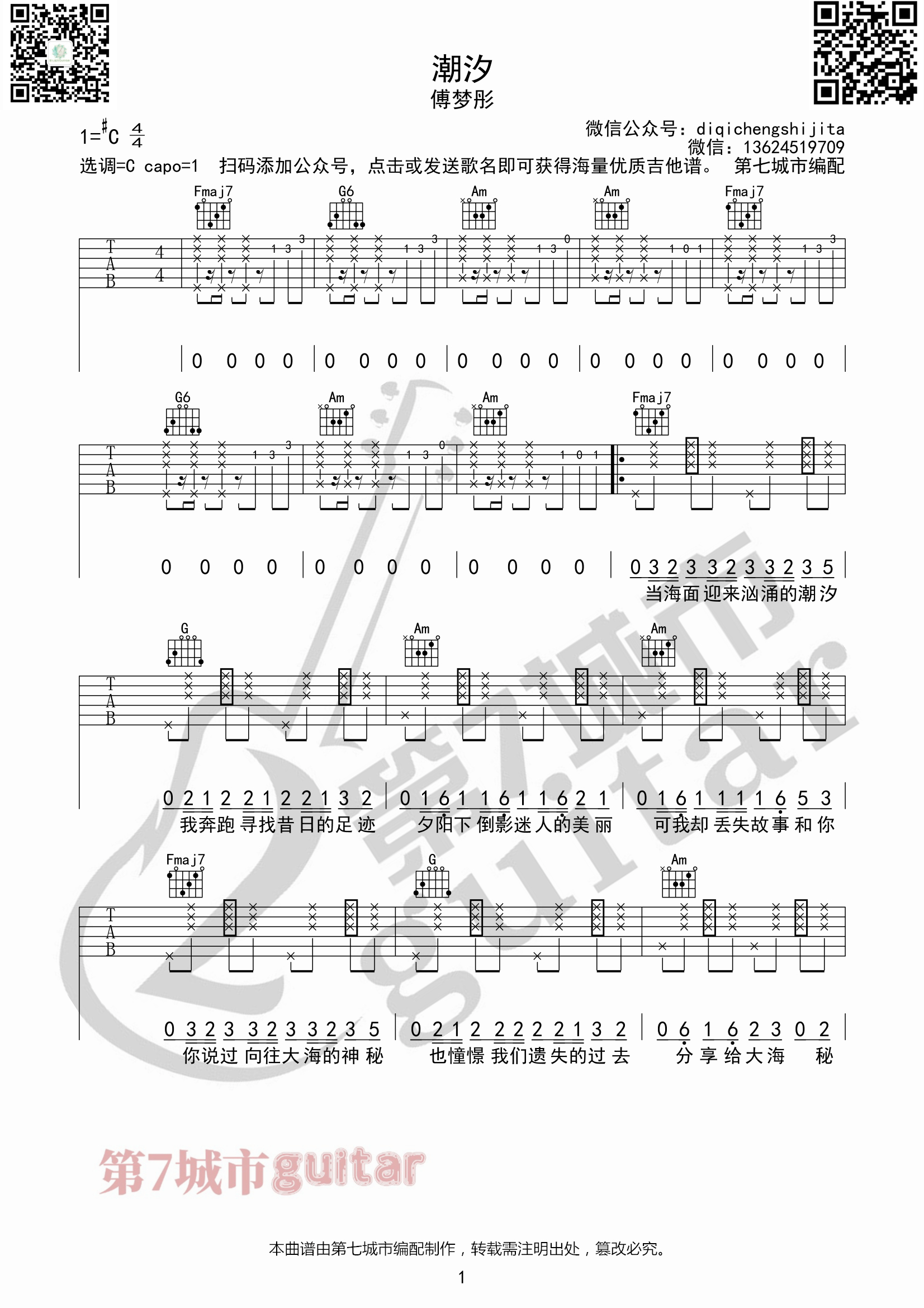 曲谱介绍: 傅梦彤《潮汐》吉他弹唱谱,采用C调指法编配,共有2张高清图谱,免翻页排版设计。