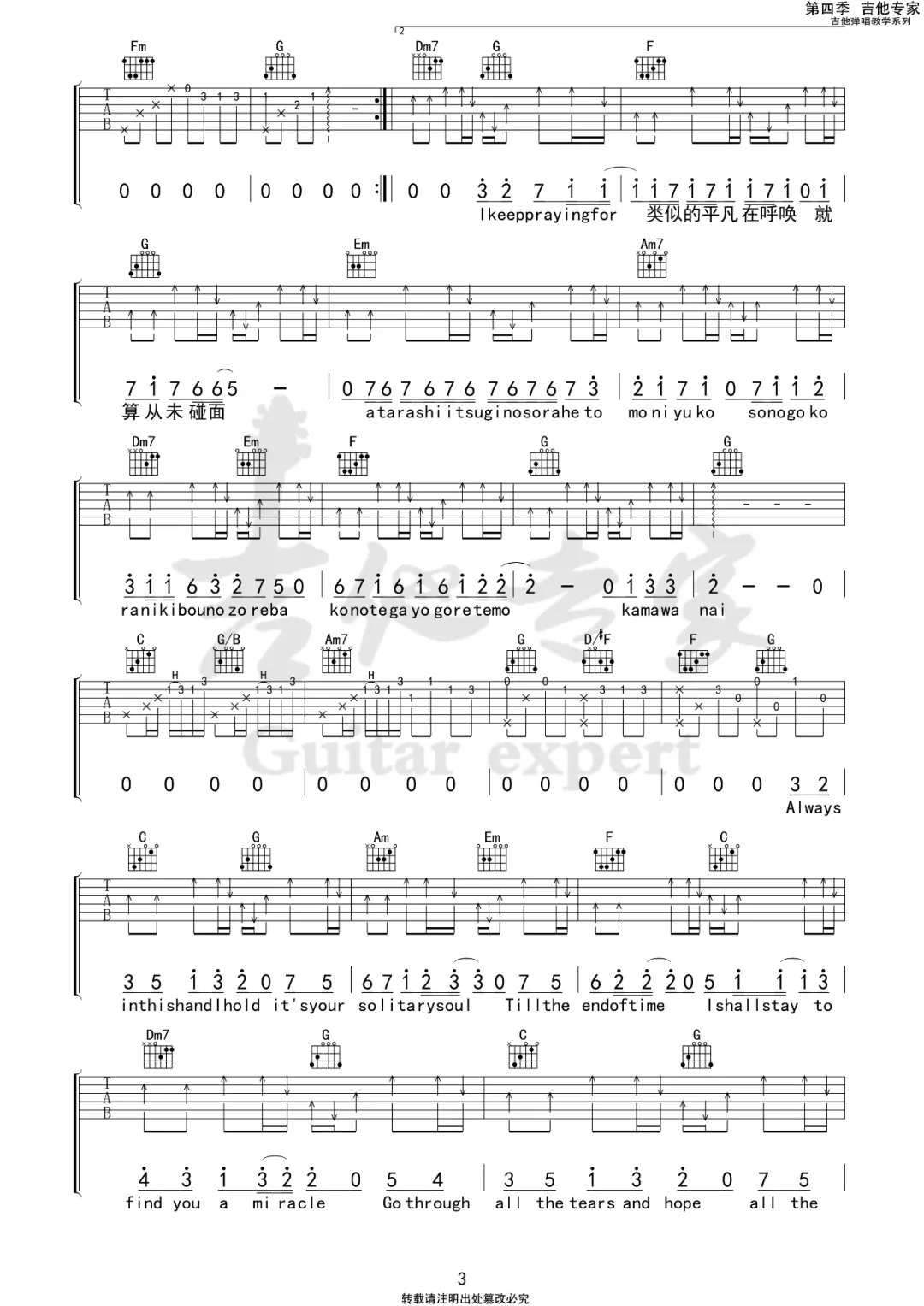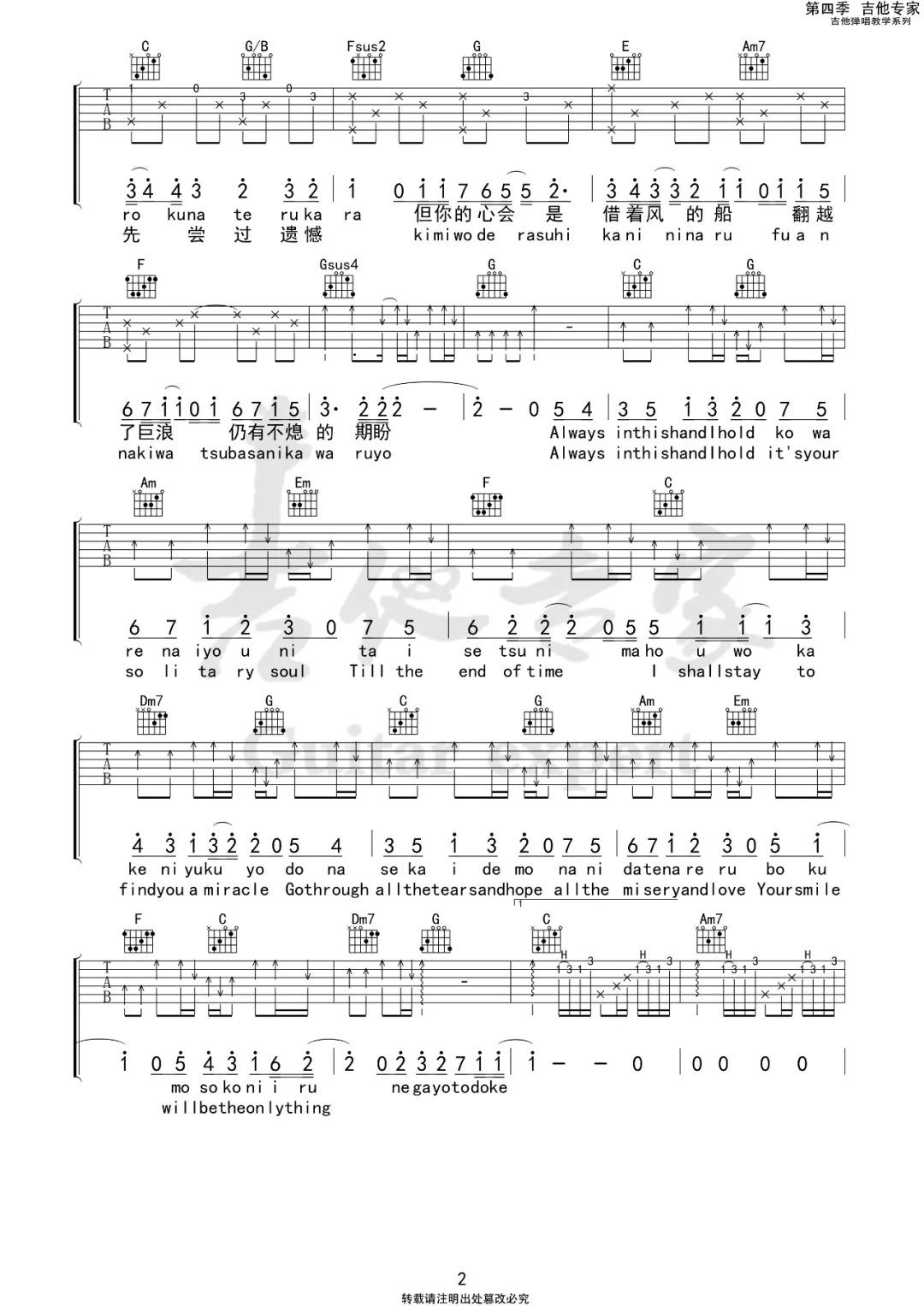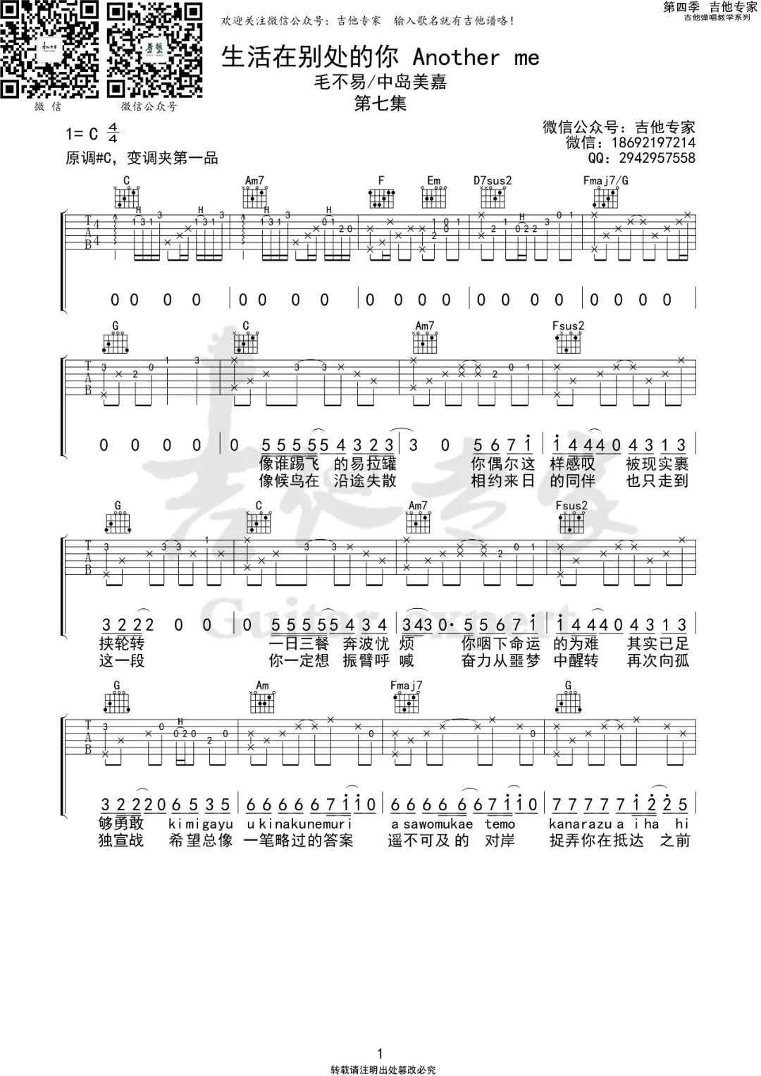 曲谱介绍: 毛不易/中岛美嘉《生活在别处的你》吉他弹唱谱,采用C调指法编配,共有4张高清图谱。