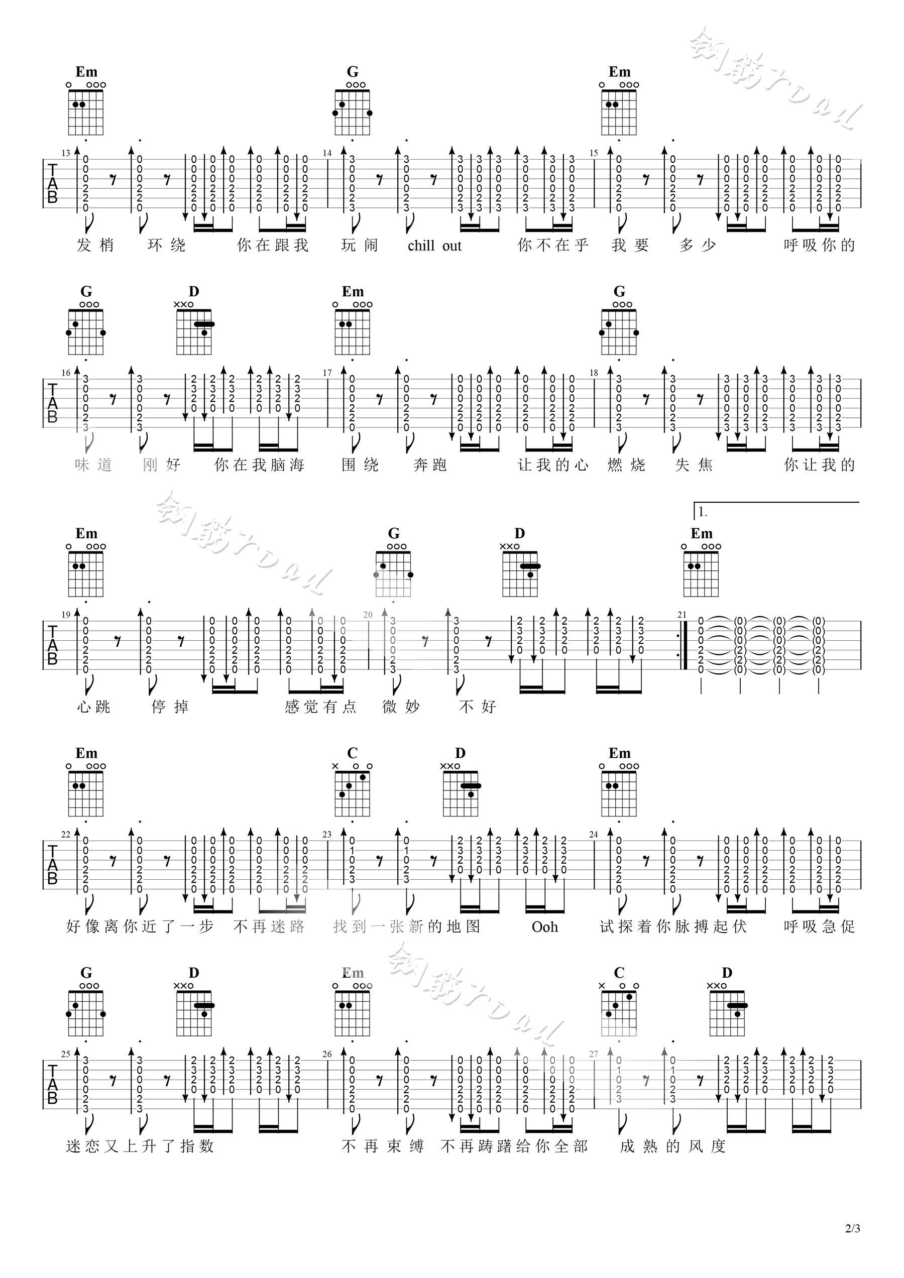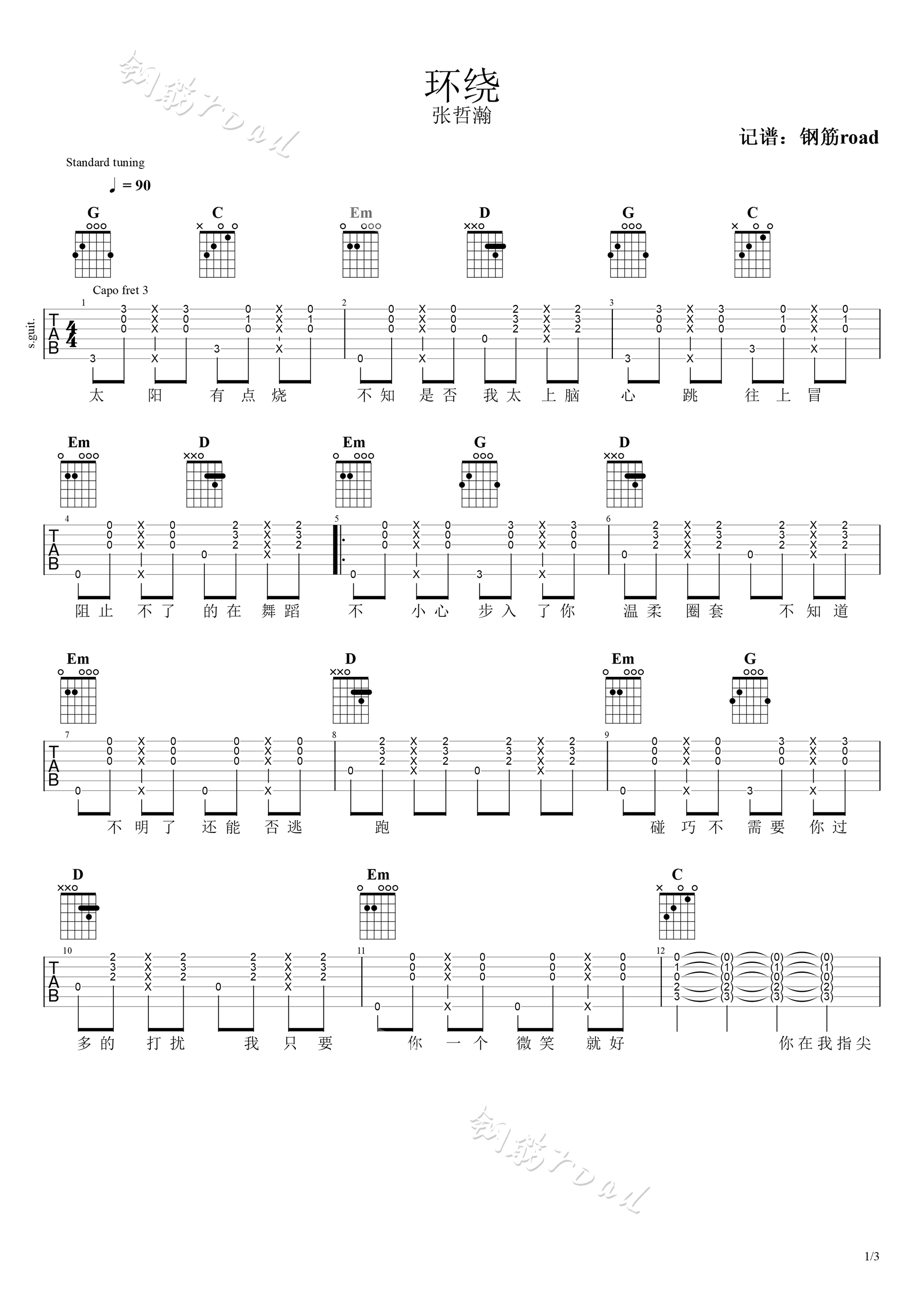 曲谱介绍: 张哲瀚《环绕》吉他弹唱谱,采用G调指法编配,共有3张高清图谱。