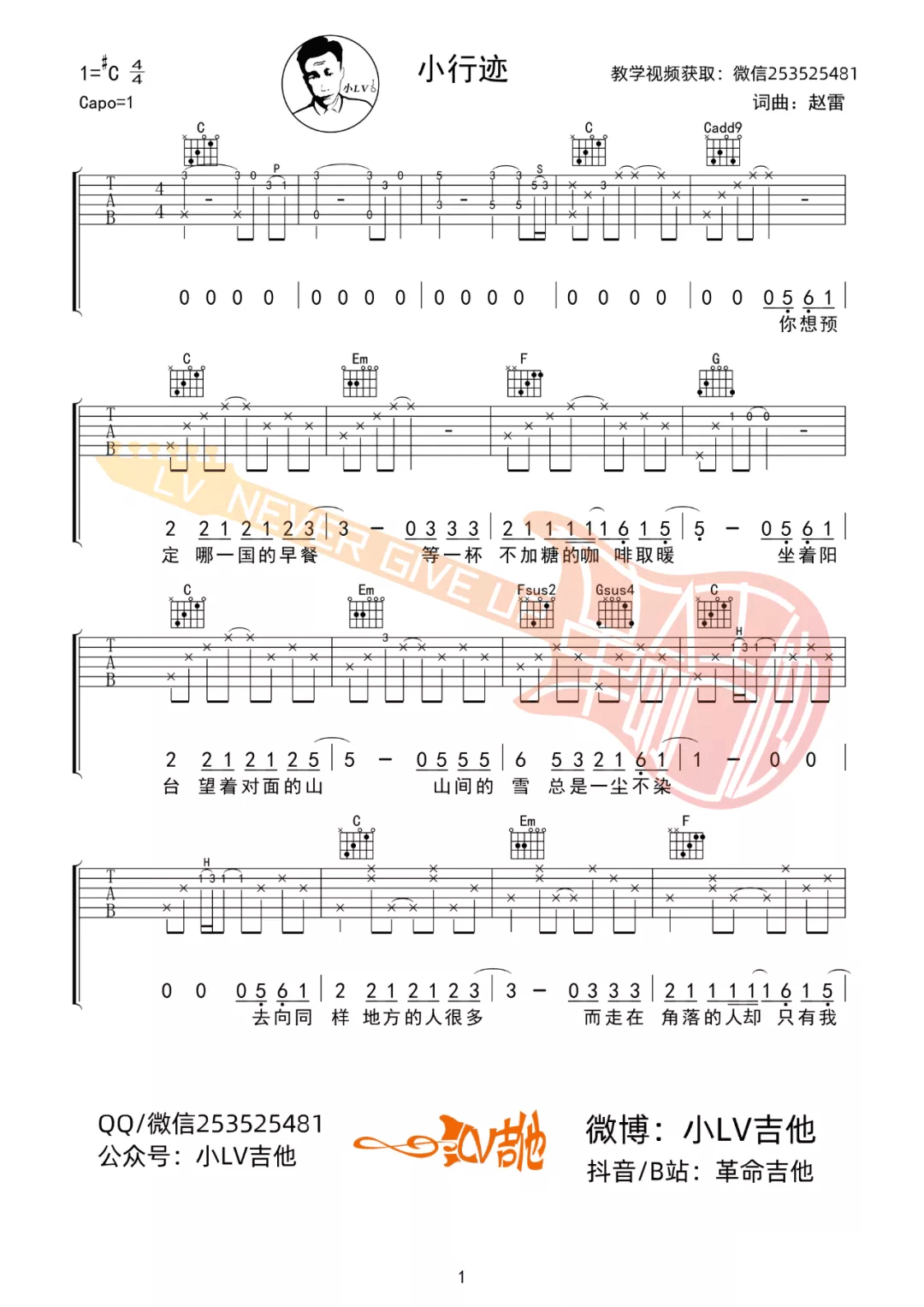 曲谱介绍: 赵雷《小行迹》吉他弹唱谱,采用C调指法编配原版,共有4张高清图谱。