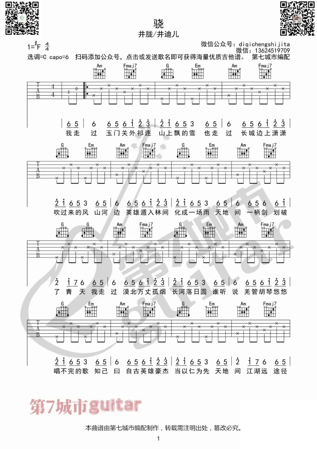 曲谱介绍: 井胧/井迪儿《骁》吉他弹唱谱,采用C调指法编配,共有2张高清图谱,免翻页排版设计。