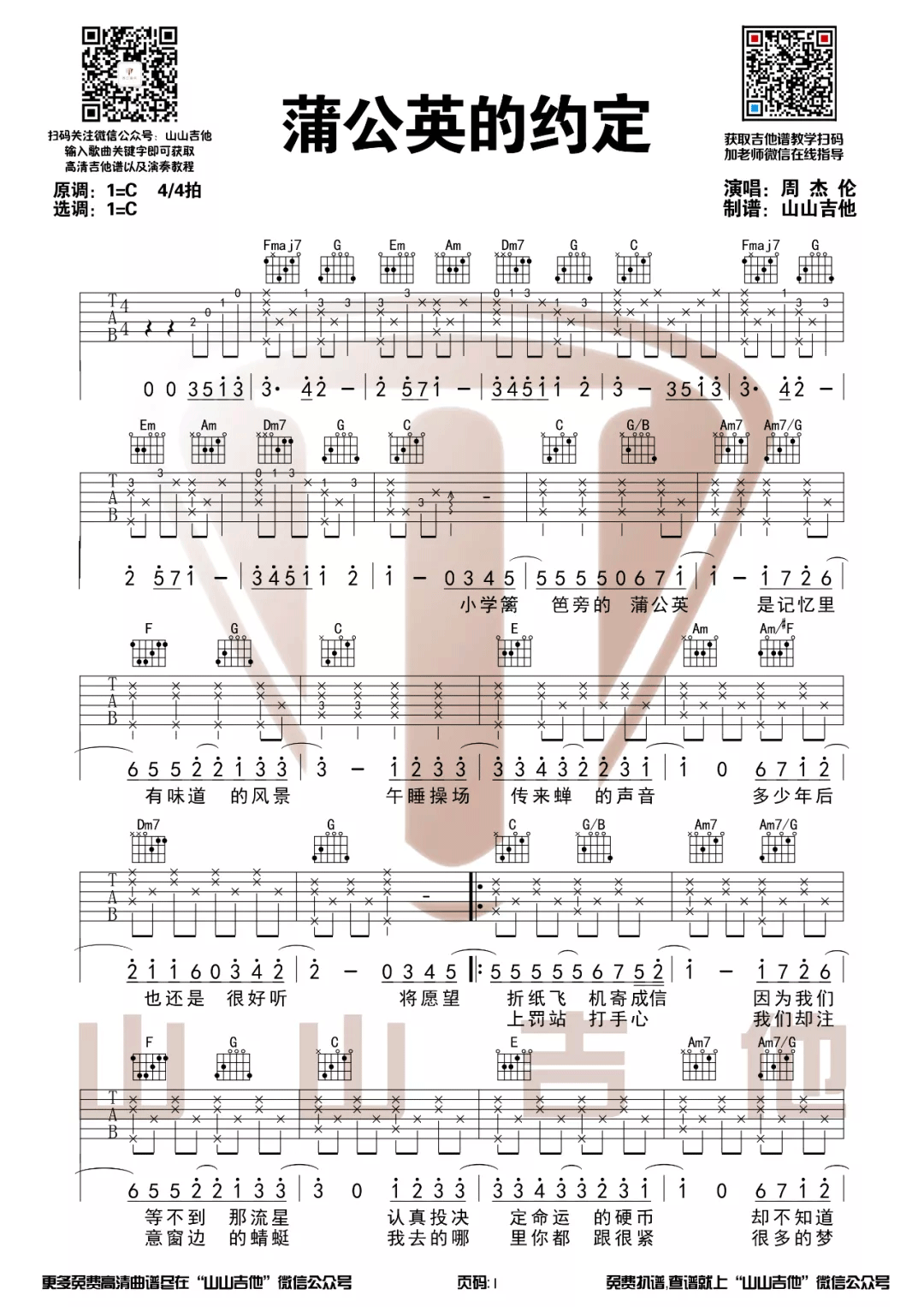 曲谱介绍: 周杰伦《蒲公英的约定》吉他弹唱谱,采用C调指法编配,共有3张高清图谱。
