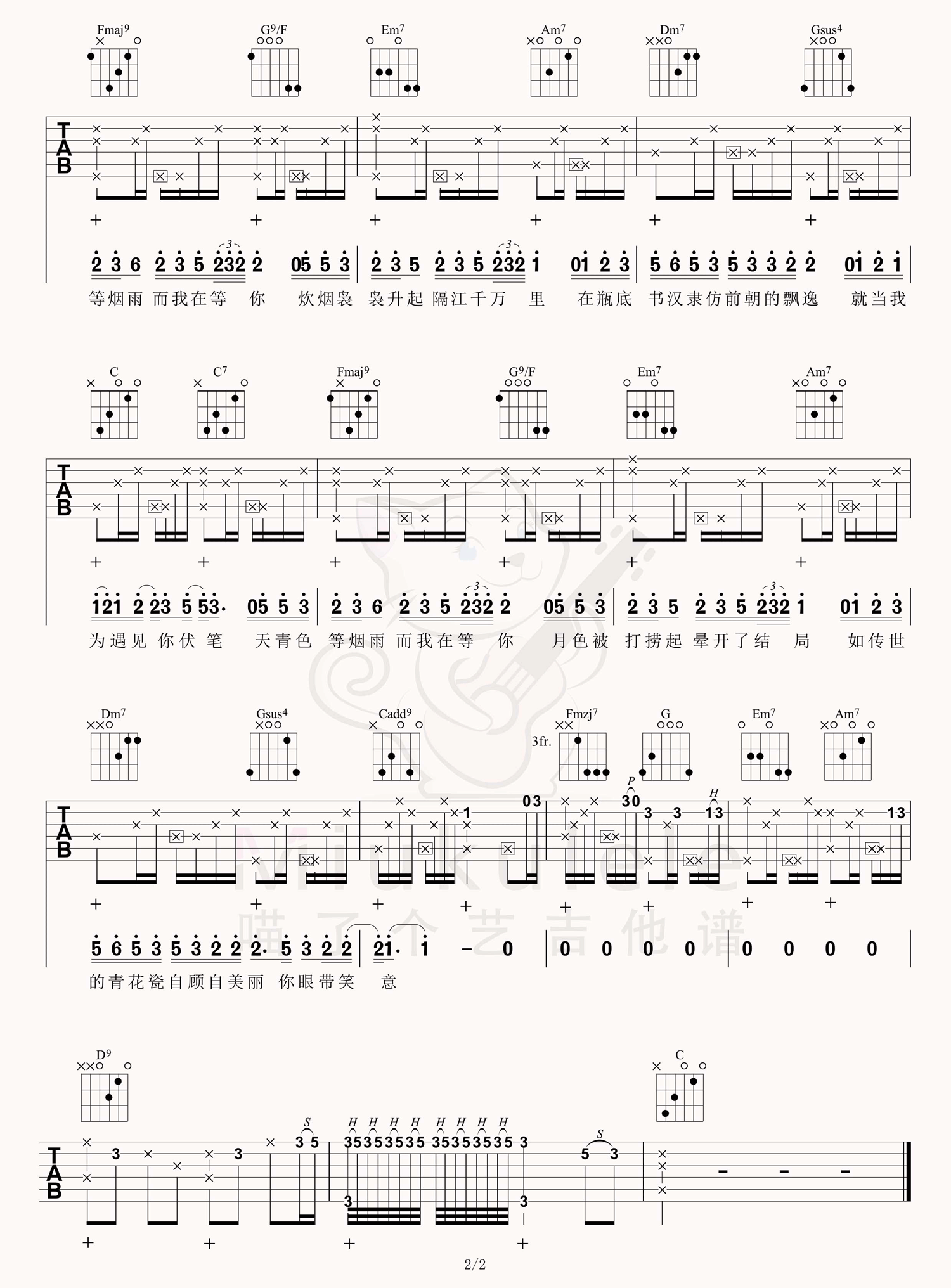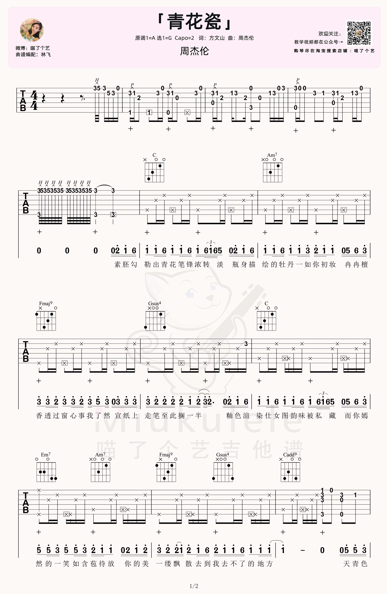 曲谱介绍: 周杰伦《青花瓷》吉他弹唱谱,采用G调指法编配原版,共有2张高清图谱,免翻页排版设计。