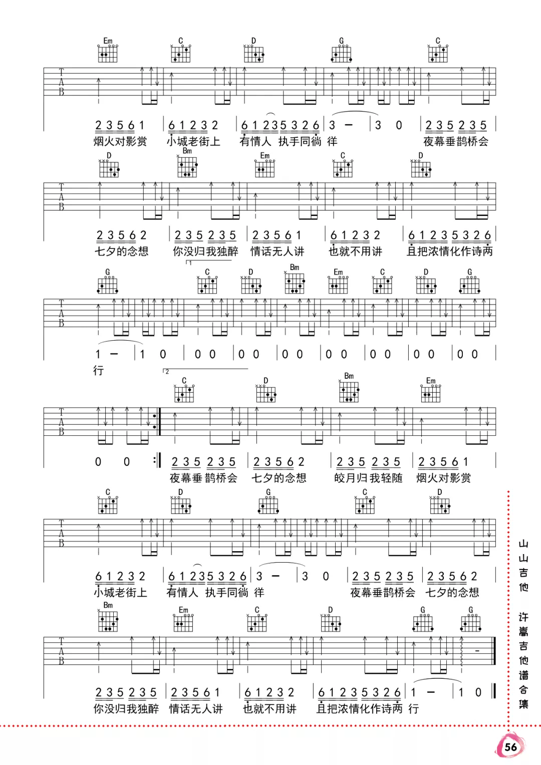 曲谱介绍: 许嵩《七夕》吉他弹唱谱,采用G调指法编配原版,共有2张高清图谱,免翻页排版设计。