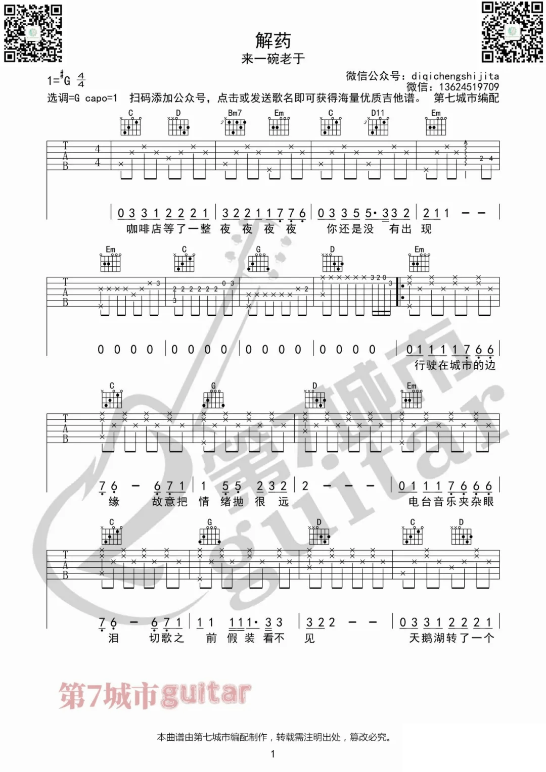 曲谱介绍: 来一碗老于《解药》吉他弹唱谱,采用G调指法编配,共有3张高清图谱。