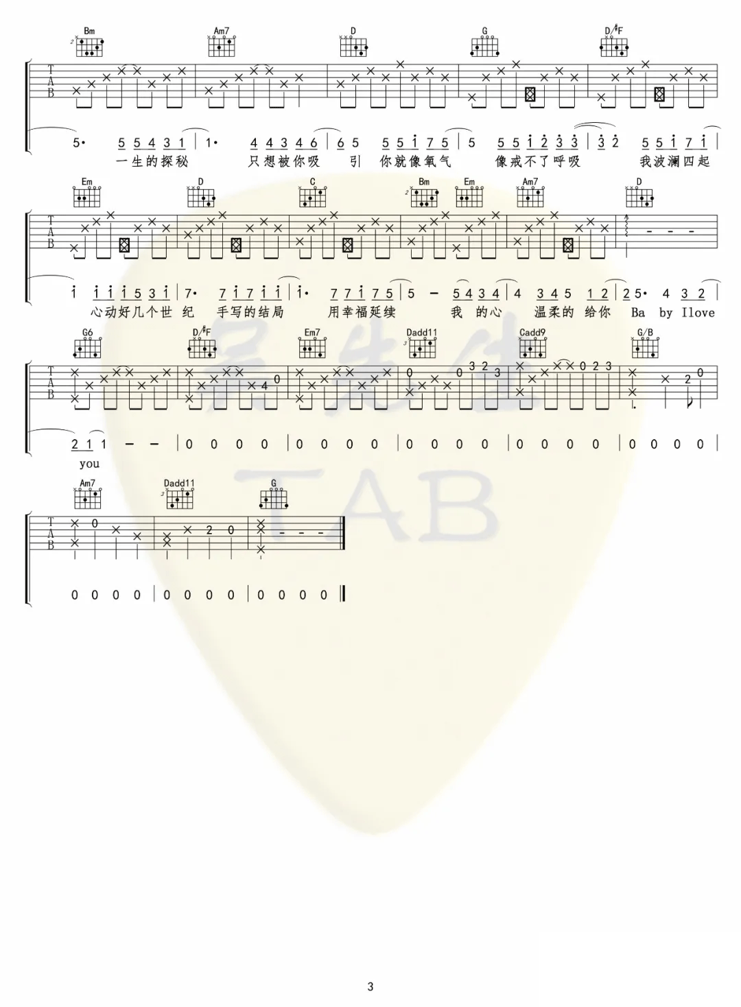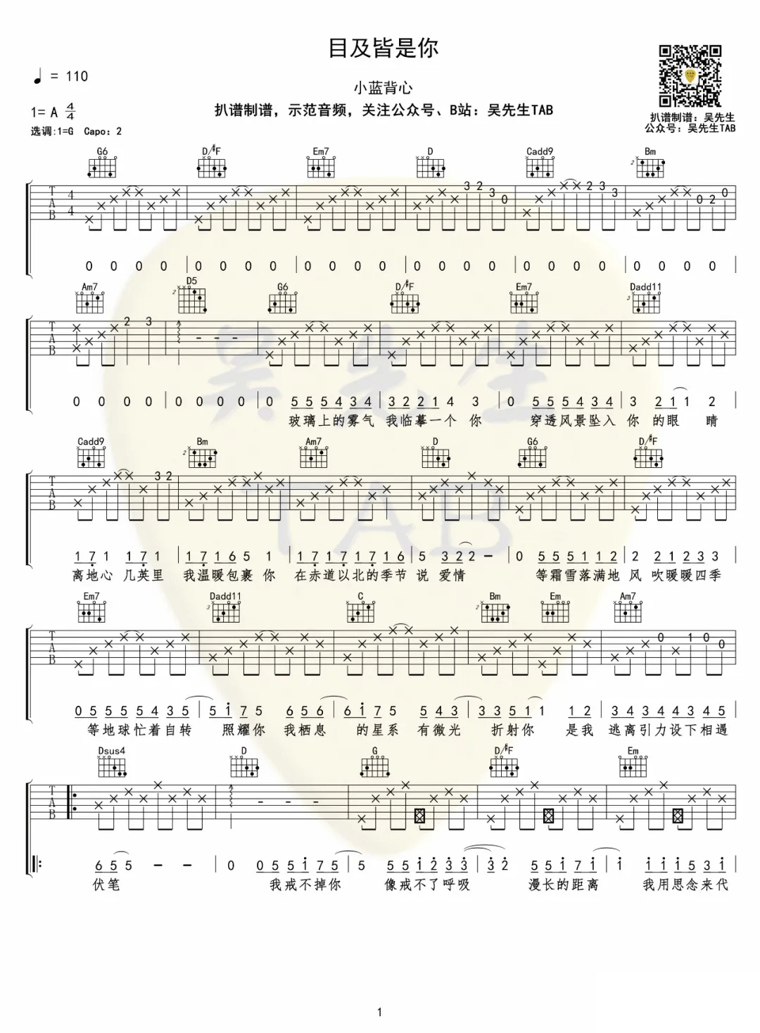 曲谱介绍: 小蓝背心《目及皆是你》吉他弹唱谱,采用G调指法编配,共有3张高清图谱。